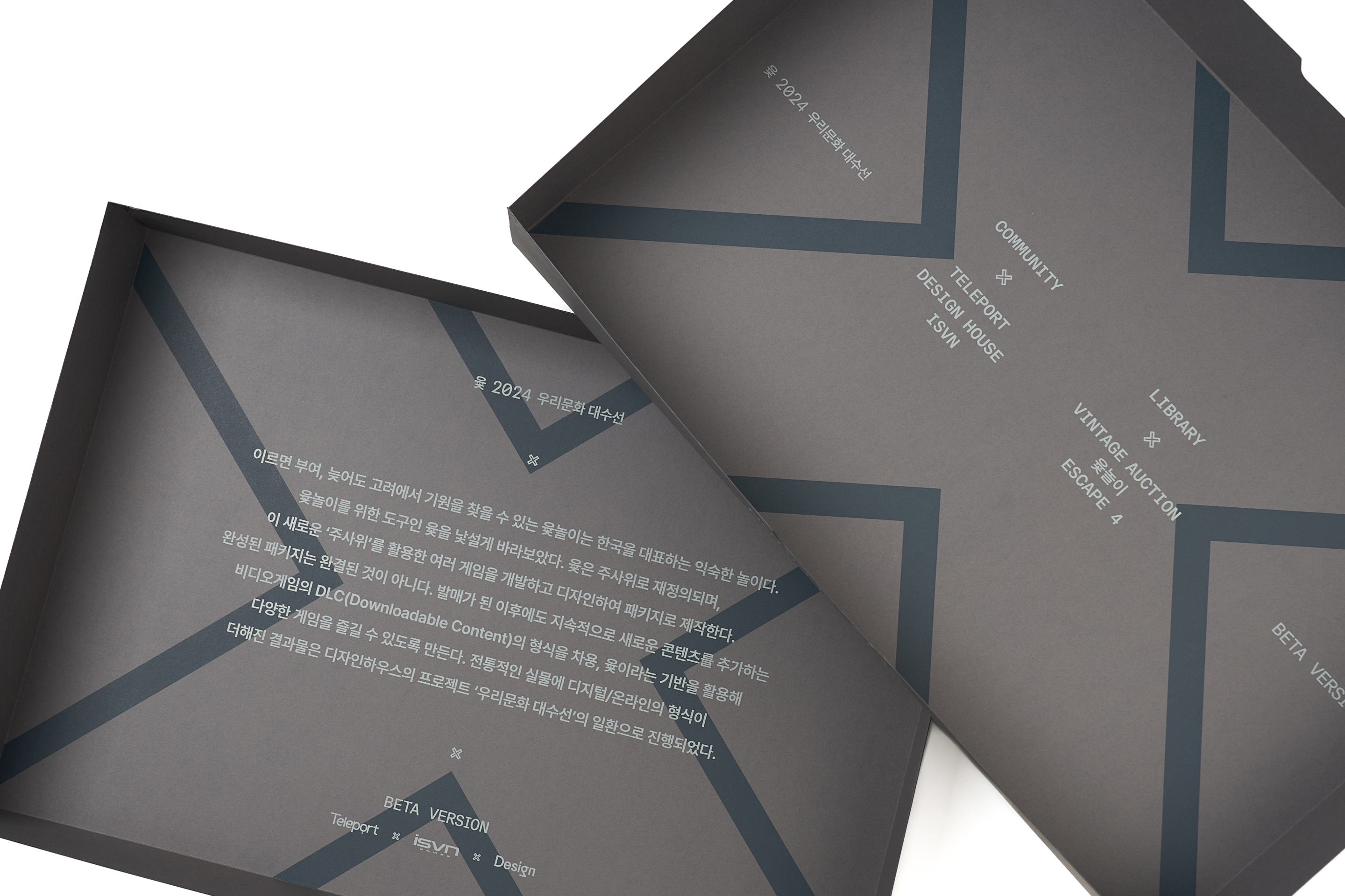 월간 <디자인>이 주목한 것은 다름 아닌 윷놀이다. 네 개의 윷과 말판으로 구성된 윷놀이는 단순한 구성 덕분에 오히려 관점의 해석에 따라 파격적인 변신이 가능하다고 판단했다. 파트너로 나이키, 29CM, 포스트 아카이브 팩션 등과 협업하며 독창적인 브랜드 캠페인을 선보여온 크리에이티브 에이전시 ‘텔레포트’가 합류했다. 현대적인 디자인의 윷놀이 3종을 개발한 텔레포트는 젊은 감성의 그래픽 디자인과 더불어 기존의 윷놀이 형식을 탈피한 독창적인 시도를 감행했다. 참고로 이번 프로젝트는 일회성으로 끝나지 않는다. 패키지에 새겨 놓았듯 이번에 공개한 디자인은 일종의 베타 버전이다. 월간 <디자인>과 텔레포트는 내년 설을 목표로 이 놀이를 한 차례 더 업그레이드할 계획이다.