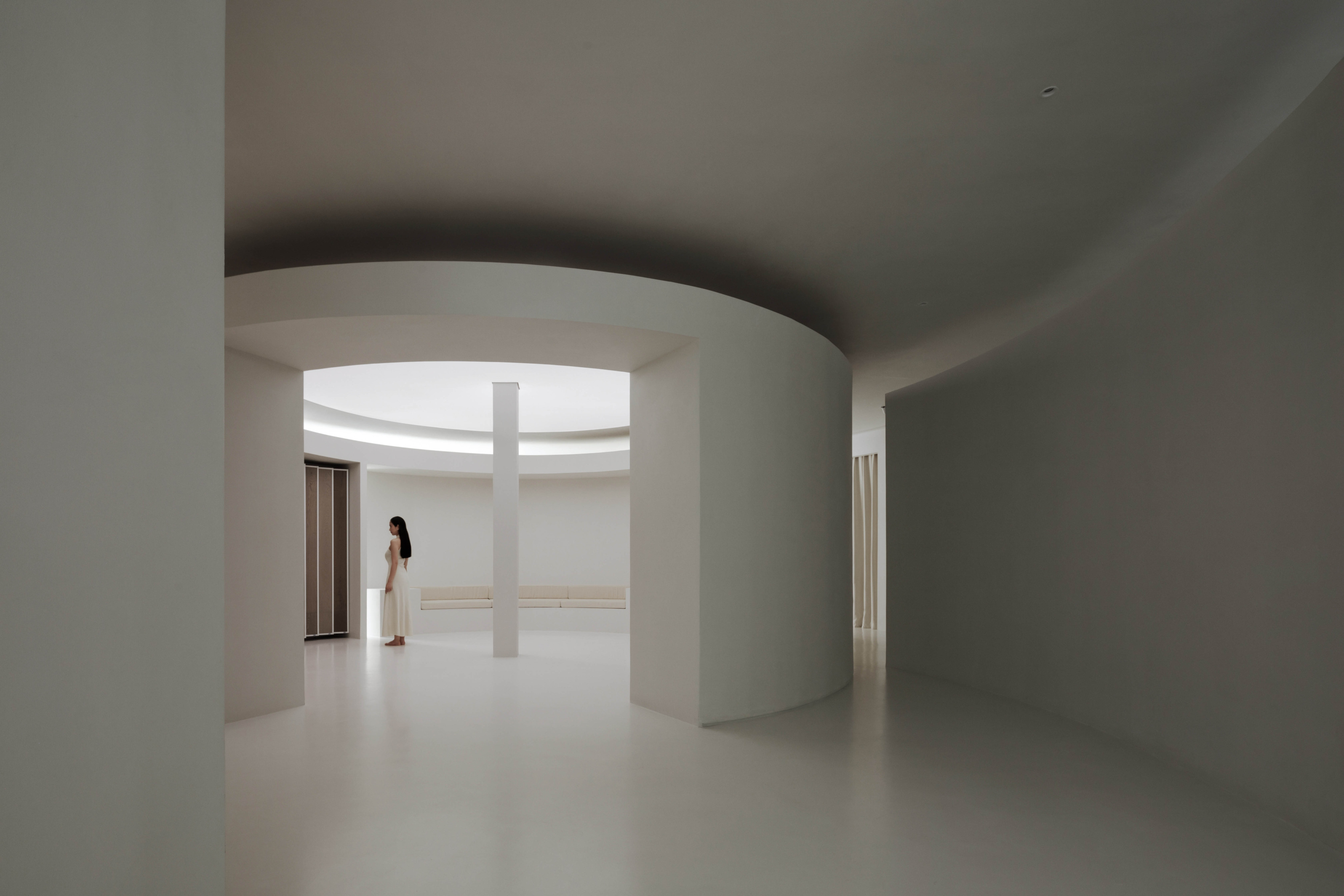 공간의 주요 동선은 원형 구조를 중심으로 형성되었다. 입구의 회색 공간과 디딤돌은 진입 속도를 느리게 하며 분위기를 환기하며, 곡선의 벽을 따라 이동하며 점차 전시 공간으로 들어서게 된다. 비로소 원형 전시 홀에 도착하면 탁 트인 개방감을 느끼게 된다. 이 외에도 여러 층위와 시점에서 다양하게 감상할 수 있도록 공간이 구성되었다.