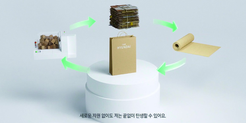 브랜드 전략팀은 조금 더 현실적인 방안을 선택했다. 긴 섬유를 만들기 위해 다른 폐지를 섞고, 프로젝트의 의미에 협조적인 공장을 찾았다. 마침내 쇼핑백의 자재인 ‘페이퍼 100’이 탄생했다. 박스를 수거하는 과정부터 참여한 사람들이 등장하는 9분 35초짜리 다큐멘터리도 함께 공개했다. 페이퍼 100을 알릴 뿐 아니라 이 과정에 참여한 모든 사람을 기록하고, 일의 의미를 공유하기 위함이었다. 백화점 16곳에 고객 참여형 전시를 열어 최종 쇼핑백 디자인은 소비자가 선택하도록 했다. 현장에서 소비자의 관심은 뜨거웠고, 이를 계기로 브랜드 전략팀은 사람들이 환경 문제를 진지하게 인식하고 있고, 특히 젊은 세대의 온도가 뜨겁다는 것을 체감했다. 이러한 열기는 모든 브랜드가 선망하는 ‘자연스러운 바이럴’로 나타났다. 또한 현대백화점 내 다른 팀과 계열사뿐 아니라 외부에서도 독립적인 자원순환 시스템에 대해 지속적으로 문의했다. 현대백화점 브랜드전략팀은 2년여에 걸쳐 연구한 시스템을 이들과 기꺼이 공유했다. 시스템 하나를 완성하는 것이 목표가 아니라 계속해서 탄소 발자국을 줄일 수 있는 방법을 연구하는 것이 프로젝트의 핵심이기 때문. 가장 상업적이라 여겨지는 백화점이 다른 생산자들을 선한 목표에 합류시키고 소비자 또한 동참시키며 브랜드의 지속 가능성 이니셔티브를 선명하게 세웠다.