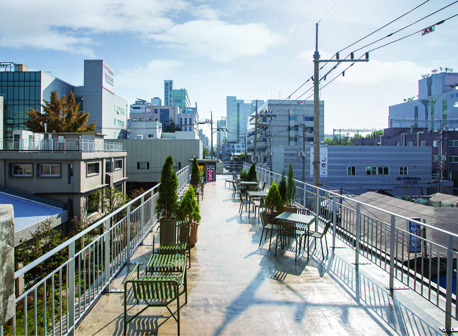 건물 가운데에 자리 잡은 성수가든은 아모레성수의 핵심 장소로 건물 중앙의 비어 있던 장소에 우리 땅에서 나고 자란 식물을 심었다. 아모레성수의 가드닝을 맡은 김봉찬 더 가든 대표는 성수가든을 ‘숲의 감각을 깨우는 정원’으로 기획했다. 그는 “숨겨져 있던 안개 분수에서 물이 뿜어져 나와 목마른 식물을 촉촉히 적셔주고, 비가 쏟아지는 날이면 습지로 변한 정원에서 물속에 잠긴 채 살아가는 식물의 놀라운 생명력을 볼 수 있도록 설계했다”고 말했다. 생태학을 바탕으로 한 암석원, 고층습원 조성 분야의 전문가인 김봉찬 대표는 제주도 베케정원으로 실력을 증명한 바 있다. 아모레성수의 건축은 HAPSA(권경민, 박천강)가 진행했다. 기획 단계에서부터 정원을 둘러싸는 회랑의 공간 구조를 제안한 덕분에 아모레성수는 실내 어느 곳에 있더라도 다채로운 풍경의 정원을 감상할 수 있다. 자동차 정비소를 개조한 건물 내부는 높낮이가 다른 바닥이나 한때 자동차를 들어 올리는 역할을 했던 호이스트 등 옛 건물의 흔적을 남겨두어 현재의 시간과 절묘하게 중첩된다. 또한 일견 한 덩어리로 보이는 벽이나 바닥도 표면 재질의 처리를 달리하여 가까이에서 보아야만 알아챌 수 있는 차원의 장소다. 건축가가 콘크리트 PC 패널을 이용해 제작한 진열장이나 빅 테이블, 스튜디오 씨오엠의 스탠드 등은 각기 다른 바닥 레벨에 따라 공간에 맞춰 제작한 가구로 각각이 부속품이 아니라 공간을 구성하는 핵심으로 존재하며 각자의 물성을 뽐낸다. HAPSA는 “아모레성수를 방문하는 고객뿐 아니라 주변의 직장인과 주민 또한 편안하게 찾을 수 있는 장소를 초기 단계부터 고려했다”고 말했다.