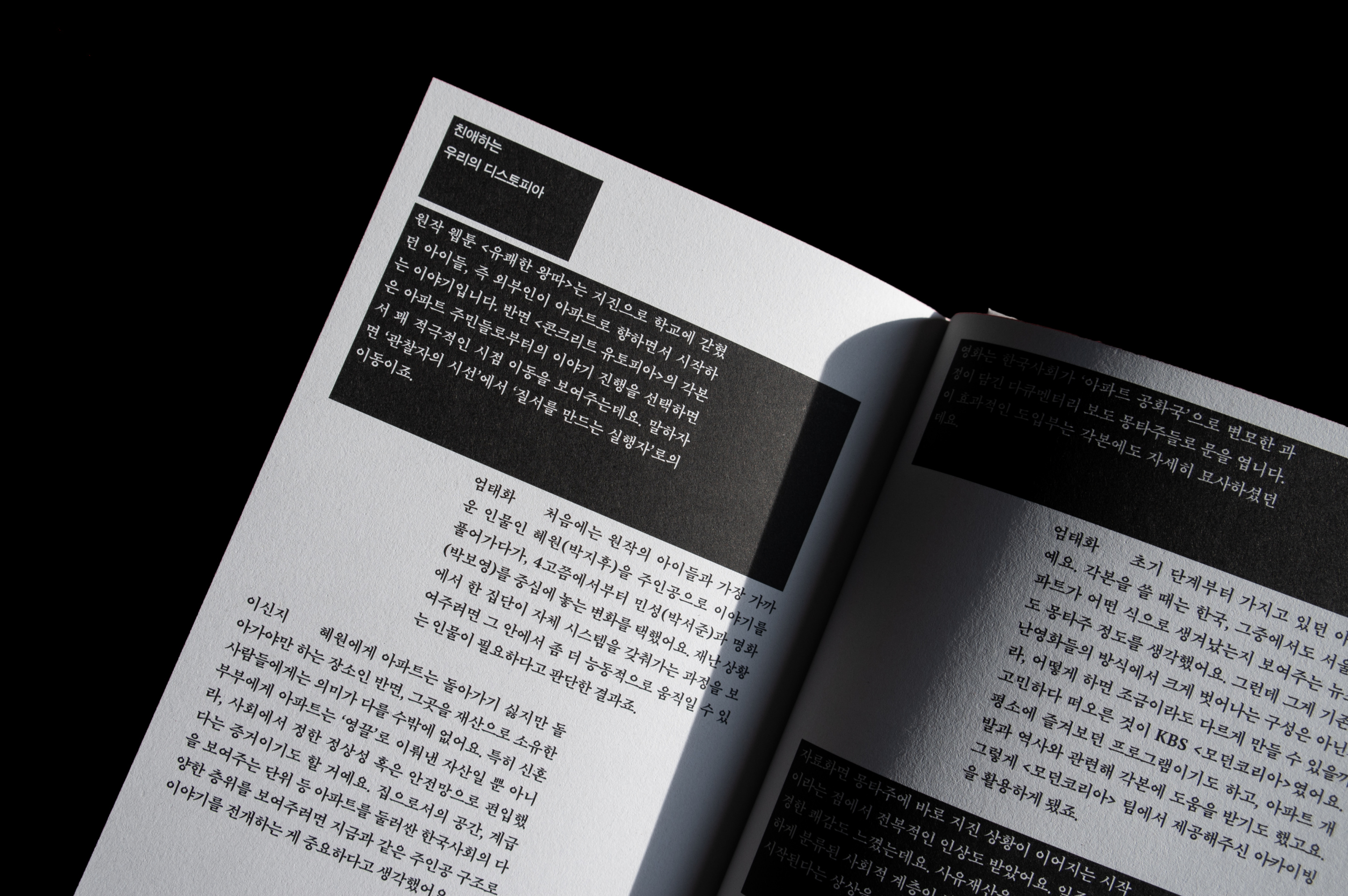 영화 〈콘크리트 유토피아〉의 각본, 스토리보드, 화보, 대담을 수록한 아카이브 북. 무너진 아파트 철근 구조를 낱자가 서로 어긋난 모습으로 시각화해 북 케이스를 장식했다. 책 표지에서 볼 수 있는 인물 실루엣은 형압 방식으로 깊게 눌러 찍어낸 것인데, 북 디자인을 맡은 6699프레스 이재영 디자이너는 “영화 속 주인공이 콘크리트에 박제된 것처럼 보이길 원했다”고 설명했다. 각 챕터 도입부는 영화의 주요 장면을 떠올리게 하는 텍스트로 포문을 연다. 볼드하고 대담한 활자가 몰입감을 높이고 글자를 감싼 직사각형 구조가 영화의 인상을 극대화한다. 본문 안쪽 여백에는 의도적으로 검은색 면을 삽입했다. 이는 책을 펼쳤을 때 물리적으로 생기는 여백을 아파트가 함몰된 공간으로 비유한 것이다. 통상 본문에 사용하지 않는 두꺼운 글자체를 사용한 것도 눈에 띄는데, 가독성을 높이기 위해 글자 간격을 세심하게 조정한 점이 인상적이다.
