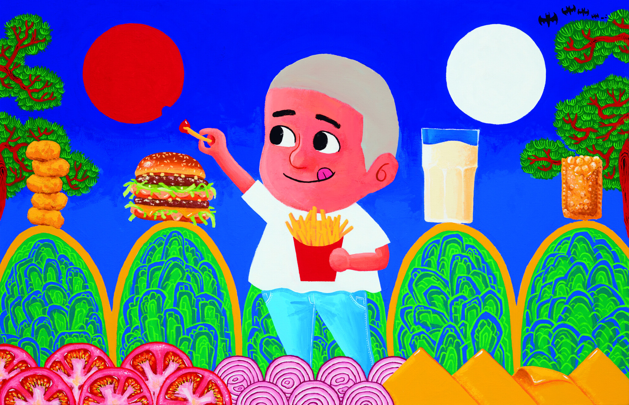 디자이너이자 일러스트레이터로서 조경규는 ‘고객 만족’을 위해 노력한다.(웃음) 내가 아무리 내 디자인을 좋아해도 결국 클라이언트의 소유물이 되고 만다. 그러니 굳이 나만의 스타일을 고집할 필요가 없다. 그래서 작업할 때는 클라이언트가 원하는 바를 최대한 실현하려 한다. 디자이너로서 내 색깔은 사실상 ‘제로’에 가깝다고 볼 수 있다. 다만 개인적으로 선호하는 스타일은 있다. 그리드 안의 여백을 최소화하고 이미지와 텍스트로 가득 채우는 것을 좋아한다. 중국집 전단지나 과자 봉지처럼 말이다. 이러한 스타일을 ‘생활 디자인’이라고 부른다. 사람들에게 필요한 정보를 최대한 많이 전달하기 위해 지면 전체를 빽빽하게 채우려고 최선을 다하는 디자이너의 모습을 떠올리며 영감을 받는다.