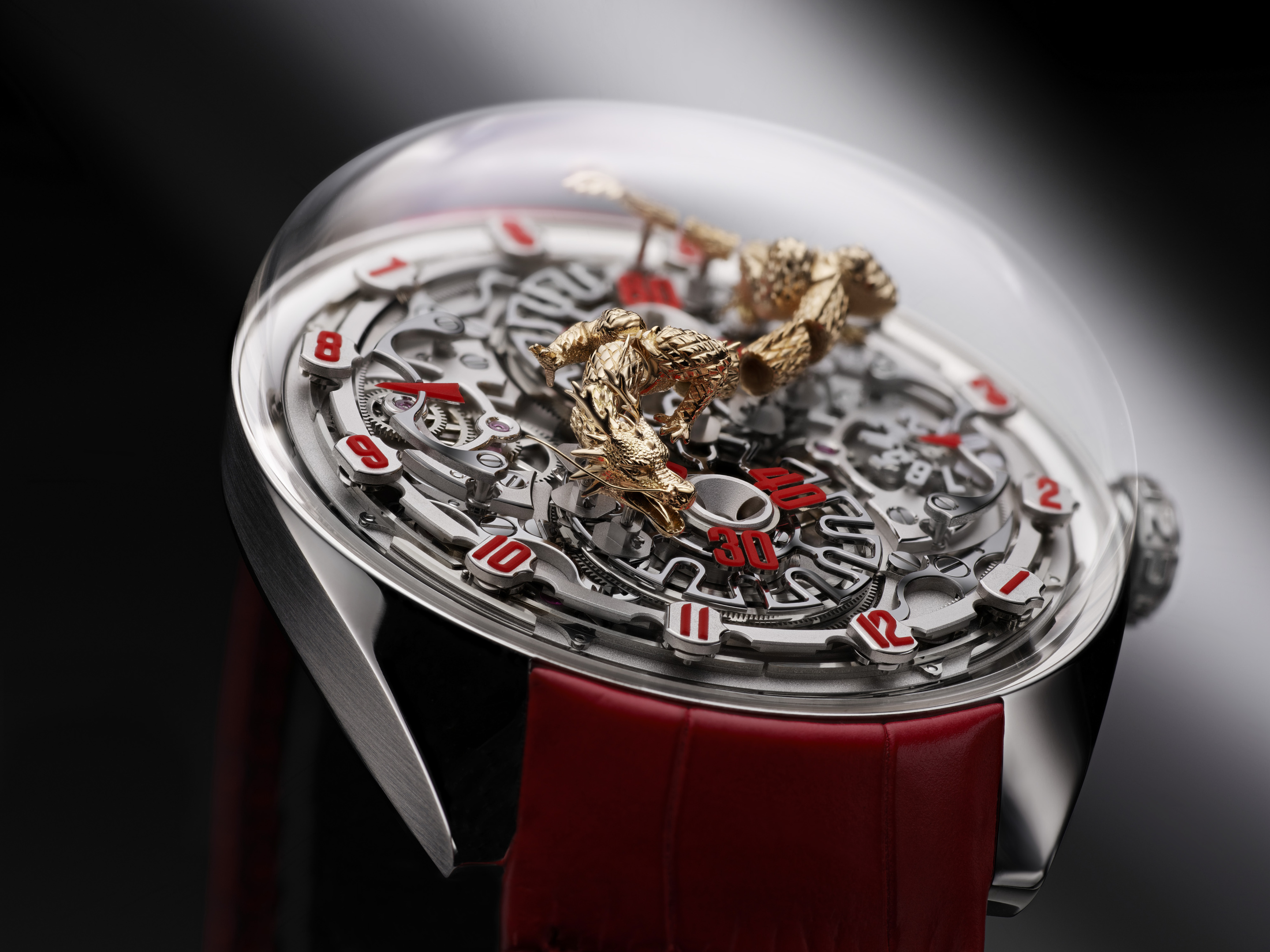 시계 제작에 참여한 이들은 전설 속에서 나오는 용을 현실감 있게 표현하는 것이 용의 해를 기념하는 시계를 만드는 데 가장 중요하다고 여겼고, 시계 안에서 움직이는 용이 필요하다고 여겼다. 그 결과 자유로우면서도 응집력 있게 움직일 수 있도록 11개의 조각과 관절로 구성된 용의 모형이 만들어졌다. 장인들은 18K 금을 활용하여 몸, 비늘, 팔다리, 발톱, 머리, 턱수염, 혀, 눈 등 용의 모든 모습을 섬세하게 손으로 제작했다. 더 놀라운 점은 용이 행운의 숫자인 8자로 움직이면서 십분 단위의 시간을 표현한다는 것이다. 이는 그저 예술 작품이 아닌, 시계로서의 역할까지 고려한 것이다.