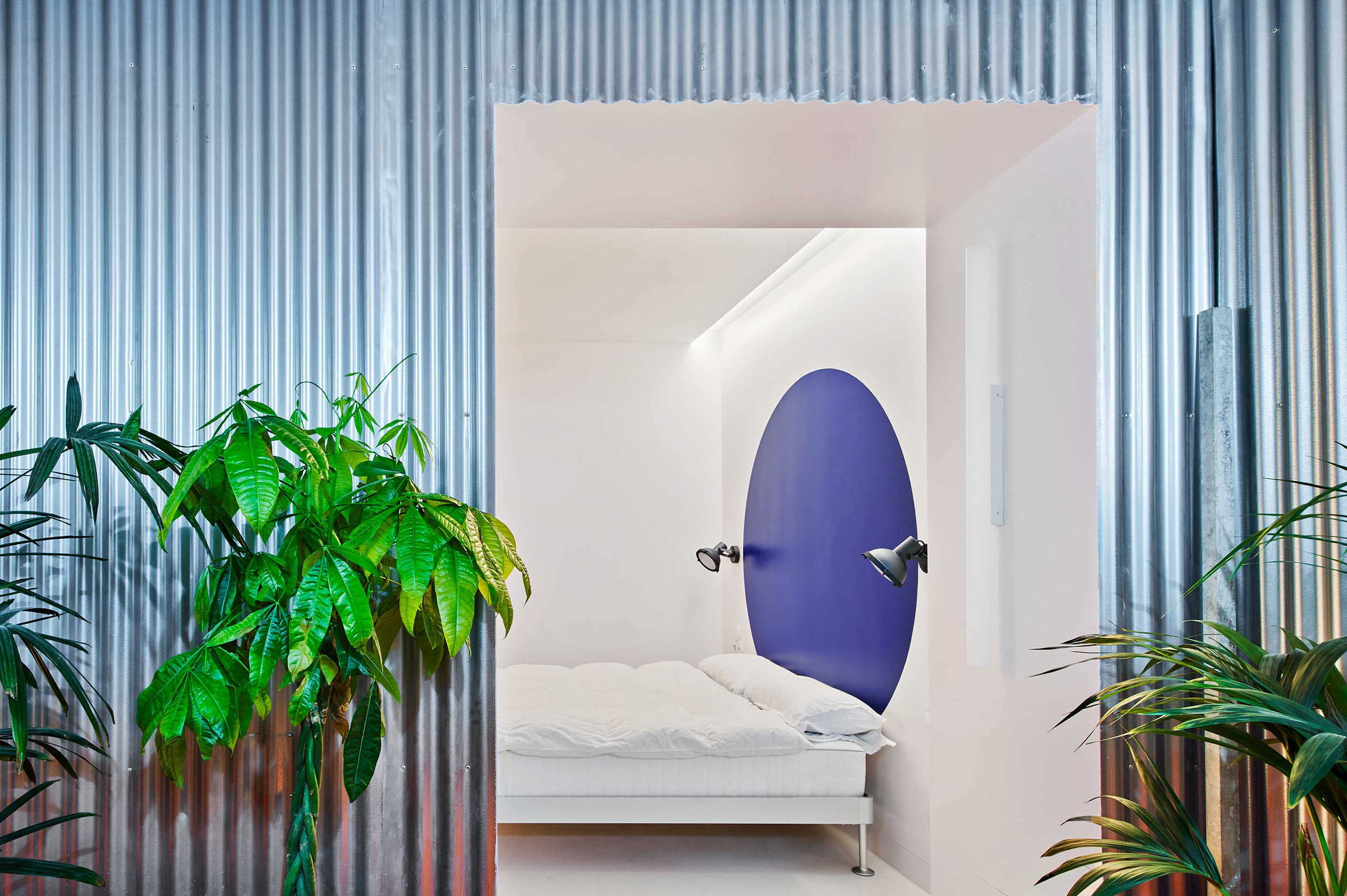 집주인 커플의 의뢰를 받은 디자인 스튜디오 포인트 슈프림(Point Supreme)은 다양한 색상과 질감을 섞는 방식을 통해 경쾌한 공간을 연출했다. 디자이너는 ‘위에서 빛이 들어오는 모습이 따뜻한 동굴처럼 느껴졌다’며 일반적인 아파트와 다르게 꾸미고자 했다고 설명한다. 특히 56㎡라는 작은 크기를 고려하여, 낭비되는 공간이 없도록 내부 벽 없이 바닥재, 커튼, 기능적인 가구들로 공간들을 구분했다. 노출 콘크리트 주위로 목재, 메탈, 강철, 유리 등 다양한 재질의 가구와 파티션들이 선명한 컬러들과 어우러져 화사하면서도 어수선하지 않은 분위기를 만들어낸다. 침실은 벽이 없는 대신, 무거운 커튼을 설치해 방음과 방풍 기능을 보완했다.