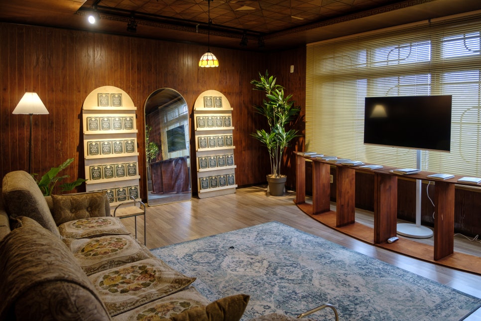 은은한 조명의 실내, 겹쳐지는 회화적 풍경