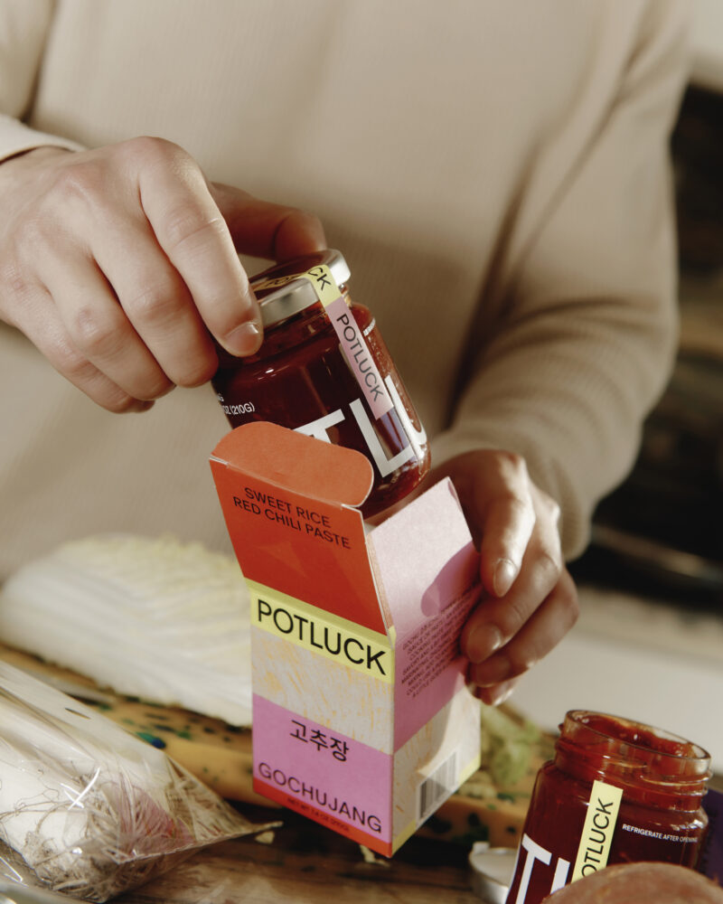 보자기의 색과 패턴을 입은 한국 식료품 브랜드 ‘포틀럭’