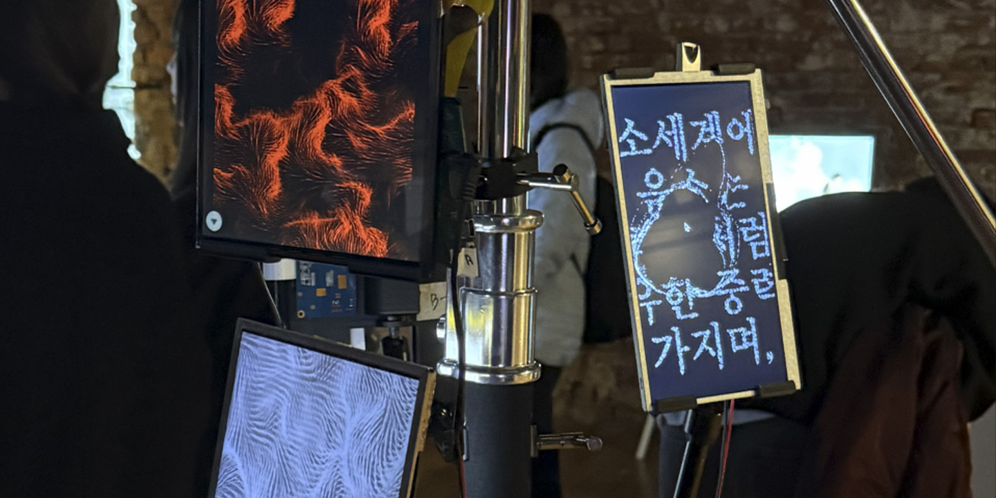 이를 통해 음운이라는 최소 단위가 새로운 질서를 만들어내는 순간을 시각적으로 경험하게 하며, 언어가 갖는 잠재적 구조가 패턴 생성과 어떤 방식으로 연결될 수 있는지 탐색한다. 관객은 화면 위에서 끊임없이 변화하는 조형을 바라보며, 비생물이 만들어낸 움직임 속에서 예상치 못한 생명성을 감지할 수 있다.