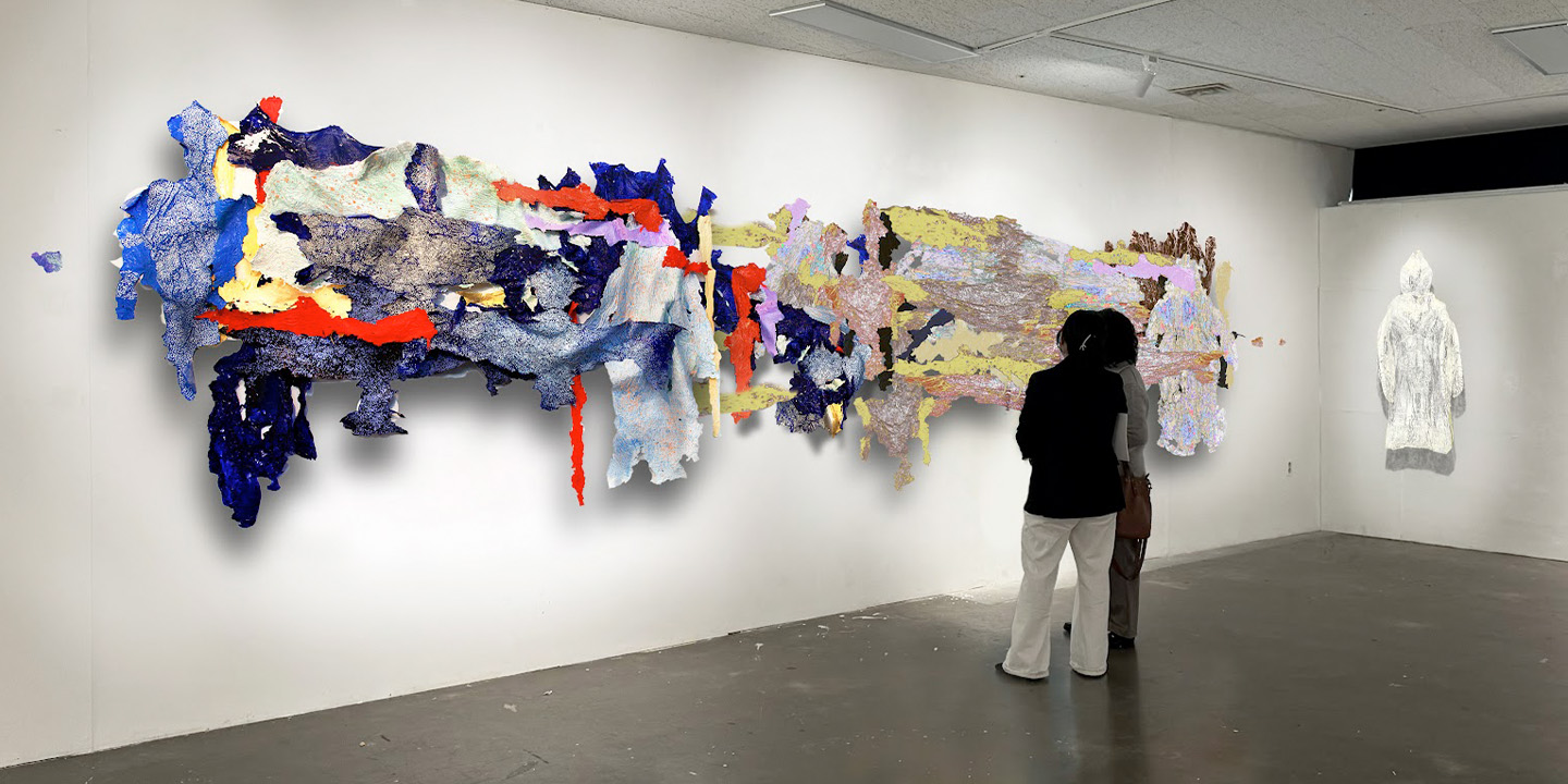 정들돌 작가는 종이와 석고 같은 연약한 재료를 층층이 쌓아 조각적 평면을 만들고, 그 위에 파편적 형상과 외국어, 시적 문장을 겹쳐 벽화를 구성한다. 전시에 선보인 작업은 완전히 해석되지 않는 조각들이 어긋나며 만들어낸 불협의 화면이 인상적이다. 작가는 이 어긋남을 통해 불완전한 삶이 지닌 잠재력을 탐구하며, 모순과 균열을 자연스럽게 받아들이는 태도를 드러낸다. 문자 조각과 누더기 같은 종이벽은 소통을 흉내 내면서도 제도적 언어를 살짝 비틀어 무력화하는 장치처럼 작동한다. 그 틈에서 겹쳐지는 작은 웅얼거림들은 하나의 합창처럼 화면 위에 남는다.