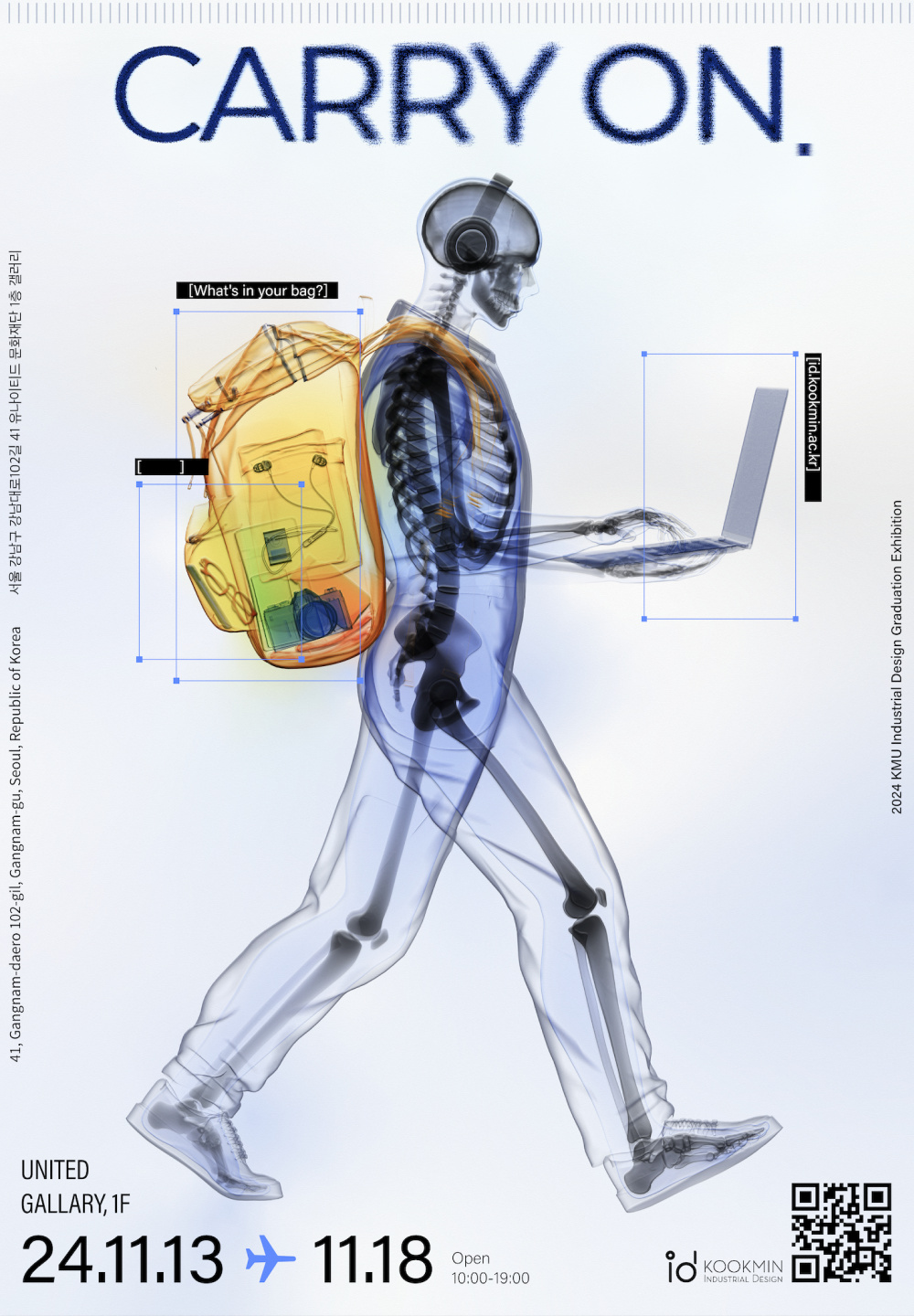 국민대학교 공업디자인학과 2024 졸업 전시 〈CARRY ON〉은 전시를 비행기 탑승 수속 중 가방을 검사받는 과정에 비유합니다. 사회로 나아가는 여정은 비행기를 타고 새로운 목적지로 떠나는 여행과 같습니다. 공항의 검색대를 통과하면서, 우리는 여행을 위해 준비한 모든 소지품들을 검사받게 됩니다. 깜빡한 짐은 없는지, 검색대에서 걸리지는 않을지, 그런 것들을 모두 껴안고 공항 검색대를 지나며 조금은 들뜬 마음으로 새로운 세계로 향하는 첫 발걸음을 내딛습니다. 학부를 마치고 사회로 나가기 위해 준비하는 52명의 졸업생들은 각자 다른 출발지와 여정을 품고 있습니다. 준비된 역량을 마음껏 펼치고자 하는 이번 전시가 마지막을 의미하는 전시가 아닌, 앞으로의 목적지를 향한 새로운 출발지가 되기를 바랍니다.
