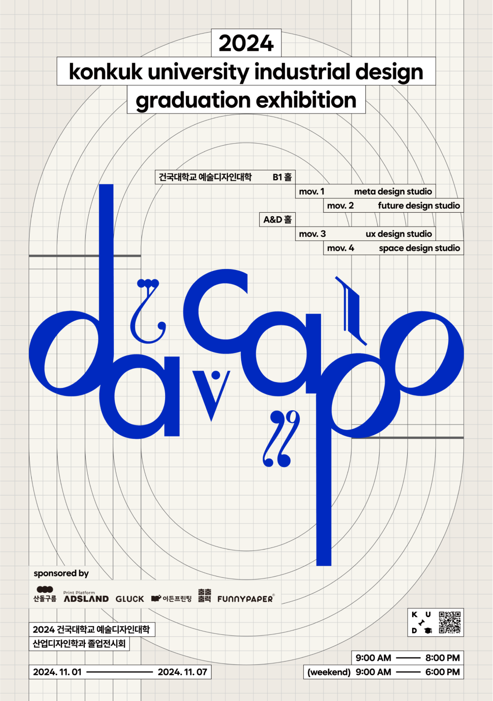 '다카포(da capo)'는 음악에서 "처음으로 돌아가 연주하라"는 뜻입니다. 지난 날들의 배움을 졸업전시를 통해 끝맺는 동시에, 앞으로 펼쳐질 사회를 향한 새로운 출발선이라는 의미를 담았습니다. 대학 생활이라는 한 편의 곡을 마치고, 우리는 이 경험을 바탕으로 새로운 선율을 만들어 나갈 준비를 하는 것입니다.