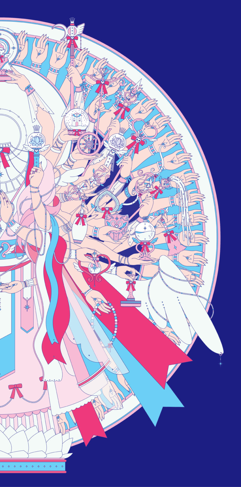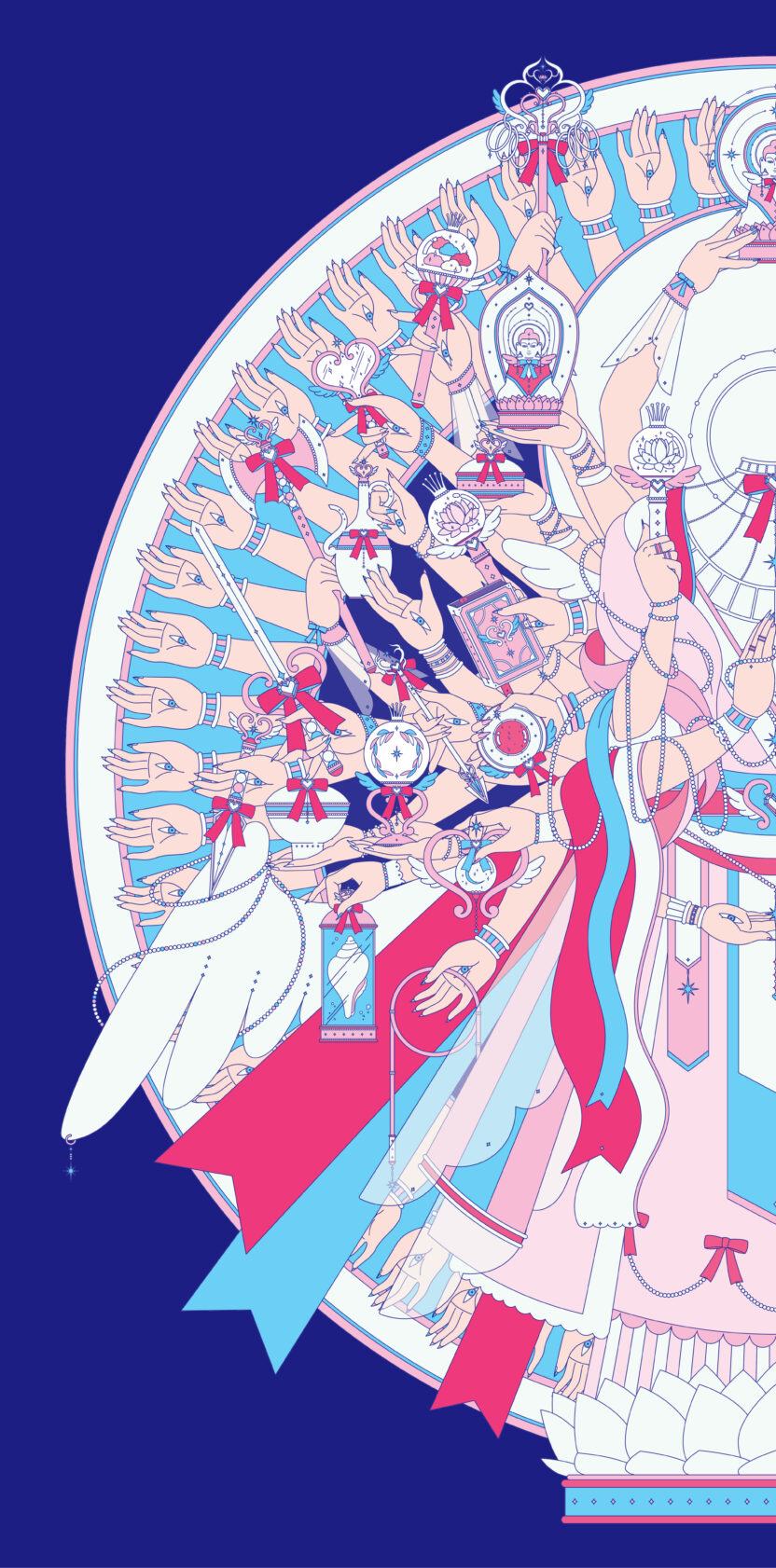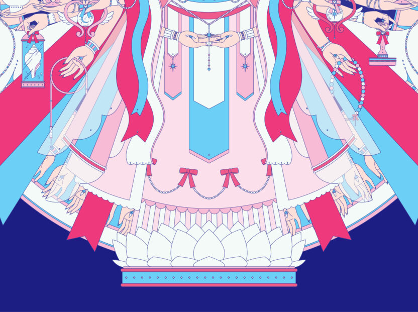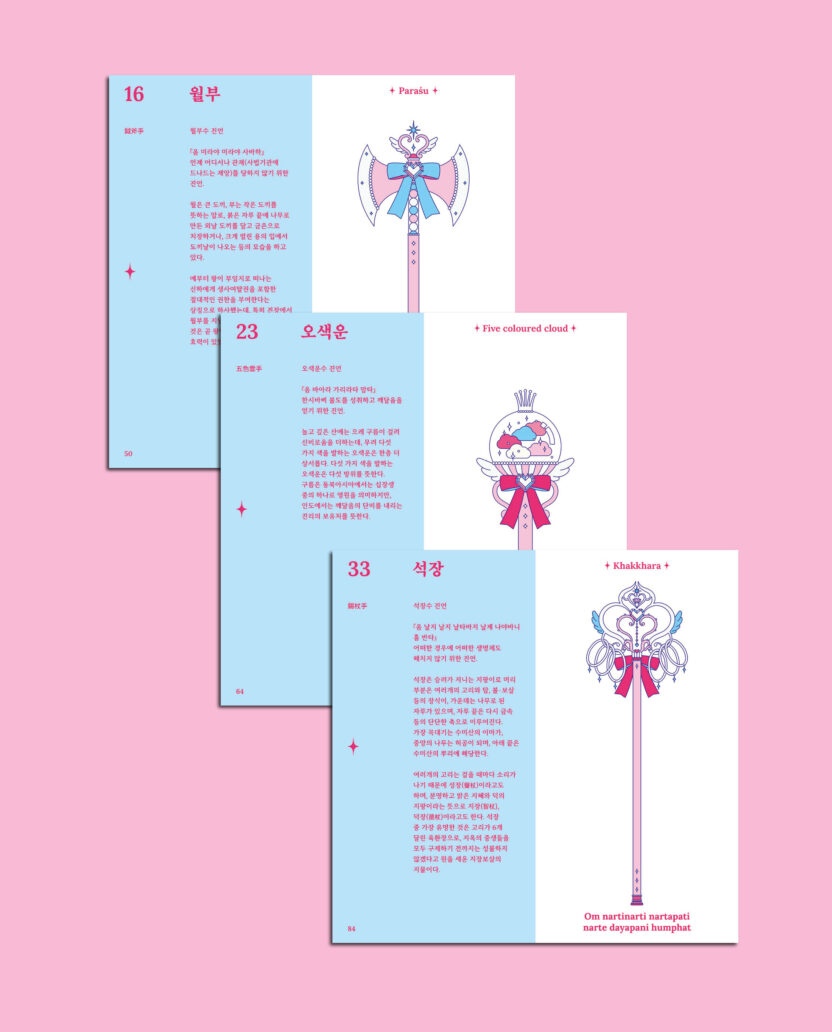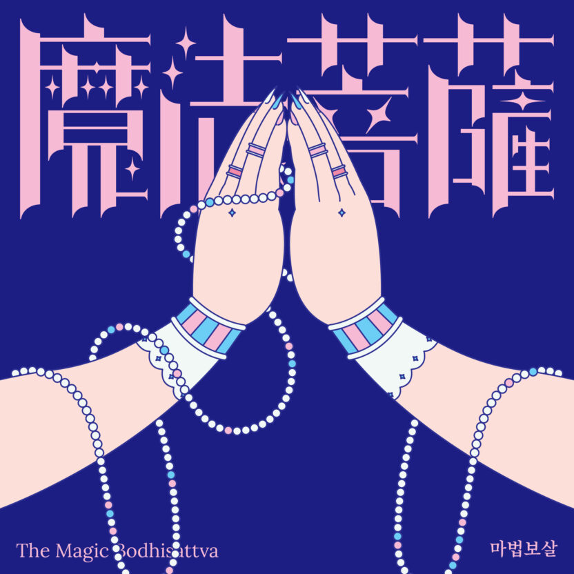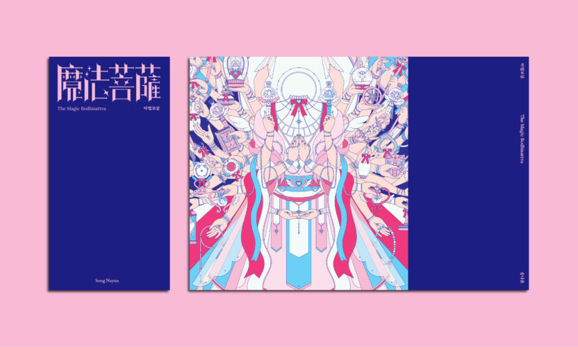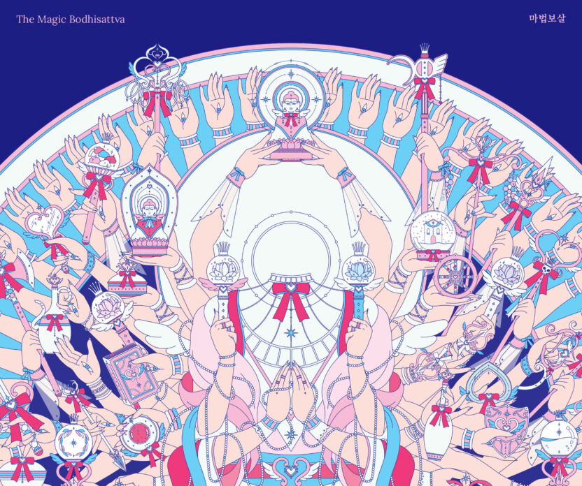 불교의 보살은 고통으로부터 중생을 구원하겠다는 사명을 가지고 있다는 점에서 악당으로부터 사람들을 구한다는 마법소녀의 정체성과 궤를 같이한다고 볼 수 있습니다. 마법보살은 이러한 생각에서 출발하여 3대 보살 중 하나인 천수천안관세음보살을 마법소녀풍의 일러스트로 재해석한 프로젝트입니다. 천수관음의 1000개의 손 중에서 중요한 42개의 손 모양을 주제로 한 진언인 관세음보살 42수 진언을 기반으로 하여 42개의 손이 들고 있는 수십 종의 지물(불교에서 여래나 보살 등이 손에 들고 있는 물건)을 마법소녀의 마법무기로 재해석한 일러스트레이션을 제작하였고, 이를 탱화의 형식을 빌려 하나의 관세음보살 일러스트로 완성하였습니다.