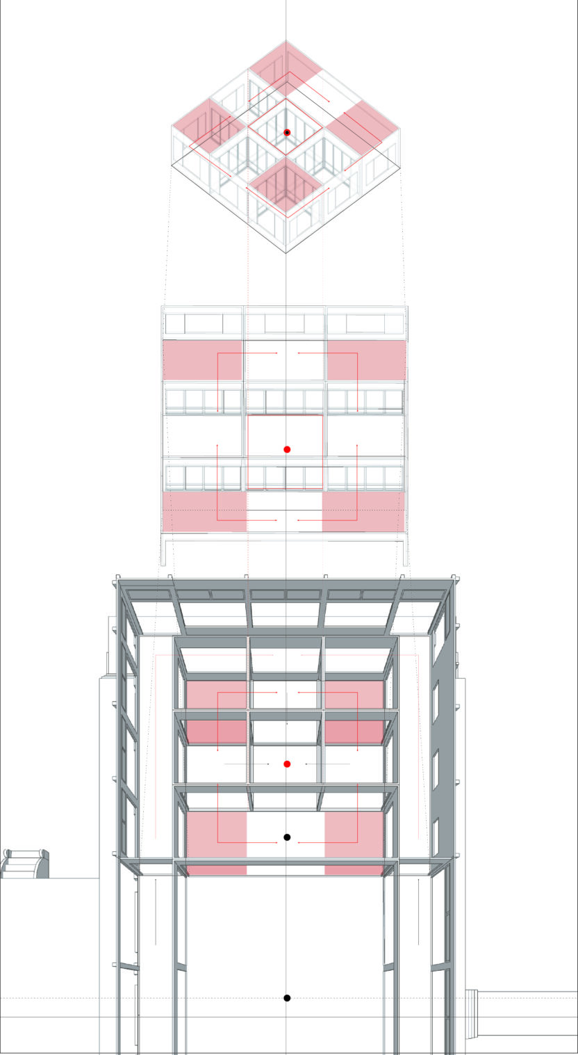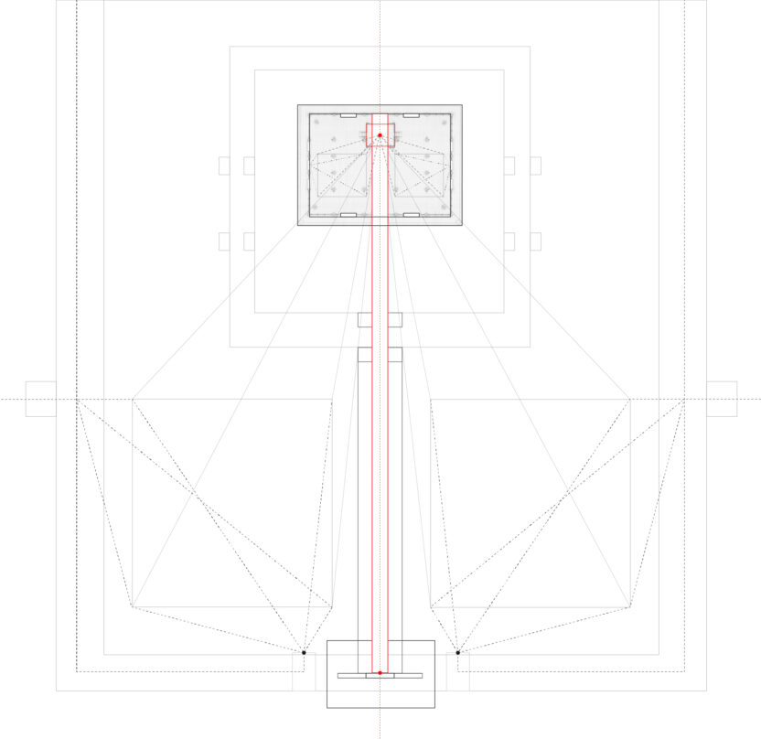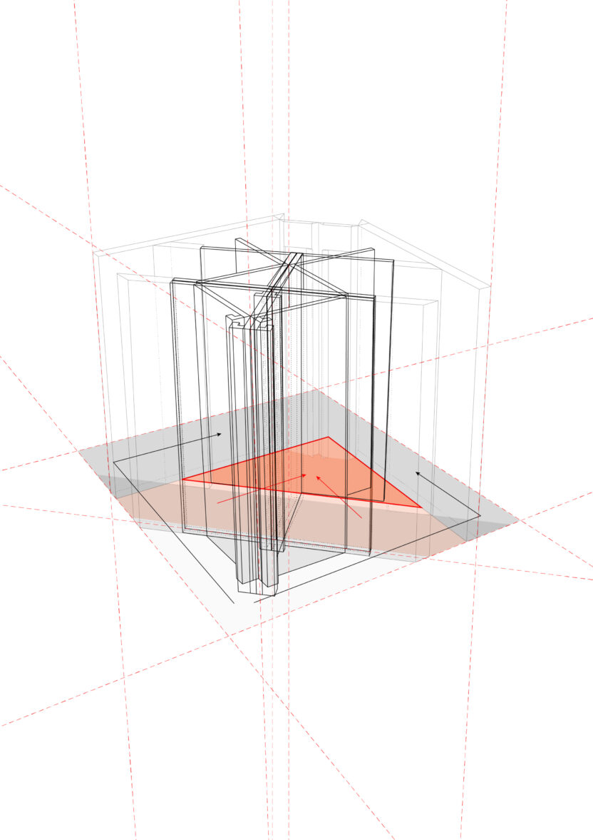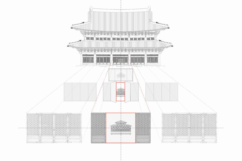 문을 경계로 공간의 정보에 차이가 생기고 이런 정보의 차이는 권력의 차이로도 이어진다. 이렇게 권력의 차이가 분명한 공간으로서 계급이 분명한 궁궐인 경복궁은 계급과 권력의 차이를 시각화하듯 성벽과 행각들이 보호하듯 애워싸고 있다. 궁궐의 가장 중심에 위치한 왕의 방인 강녕전 일원에는 네개의 보조건물이 강녕전의 꼭짓점을 둘러싸듯 배치되어 있다. 내부도 가운데 대청을 기준으로 이등분 된 내부를 다시 아홉 칸으로 나누고 가운데 방을 왕의 침소로 배치하여 마찬가지로 네 꼭짓점과 네 면을 보조 방이 모두 둘러싸고 있다. 이 보조 방들엔 신하들이 위치하며 왕의 공간으로 직행하지 않고 반드시 신하들의 공간을 거치게끔 함과 동시에 그들은 언제든지 왕의 방으로 침범할 수 있다. 모든 공간들이 연결되어 있지만 왕에게는 그 공간들을 모두 점유할 자유가 주어지지 못하고 오히려 겹겹이 쌓인 내부의 한 지점에만 머무른다는 점에서 권력의 중심과 공간의 중심간의 역전을 보여준다. 문을 경계로 어느 한쪽으로 치우쳐져 고착화된 주도권에 평등함을 부여함과 동시에 모든 공간이 연결되어 점유하기보다는 통로의 역할이 두드러지는 각 네꼭짓점에 위치한 방들이 가진 연결의 유예에 주목했다.