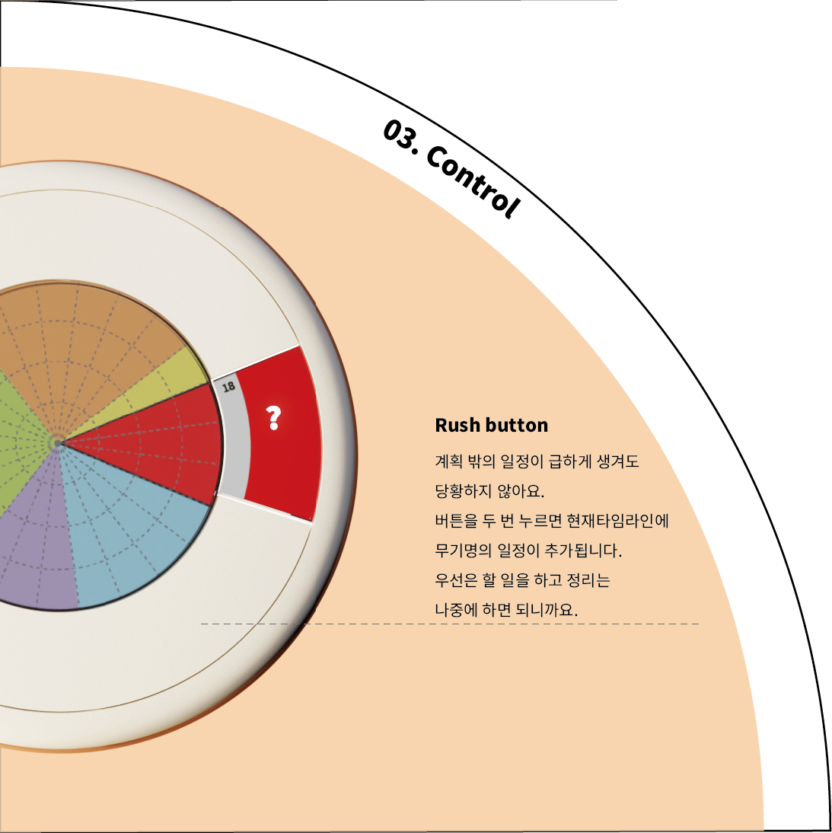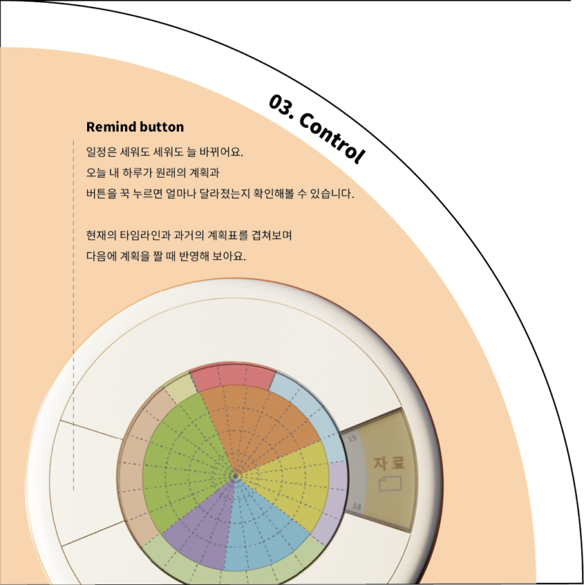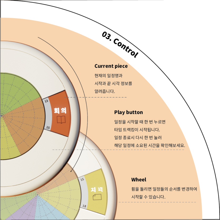 내 시간을 손에 잡을 순 없을까? 조금 더 나의 하루와 시간에 집중하고 효율적으로 다루기 위해서는 어떤 서비스가 필요할까? 기존의 캘린더 앱으로 충족할 수 없었던 집중과 통제력을 구현할 수 있는 스케줄 컨트롤 디바이스를 제시합니다. 나의 스케줄러에 기생하여 나의 시간을 쉽게 기록하고 관리해주는 내 손 안의 시간 조각 컨트롤러로 나의 시간에 온전한 주인이 되도록 도와줍니다.