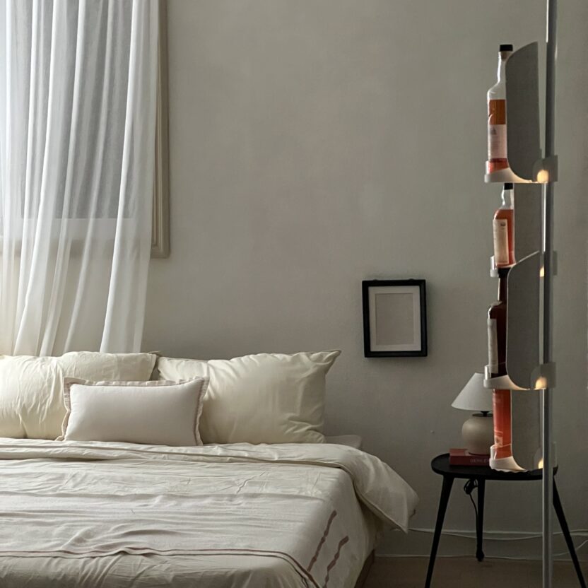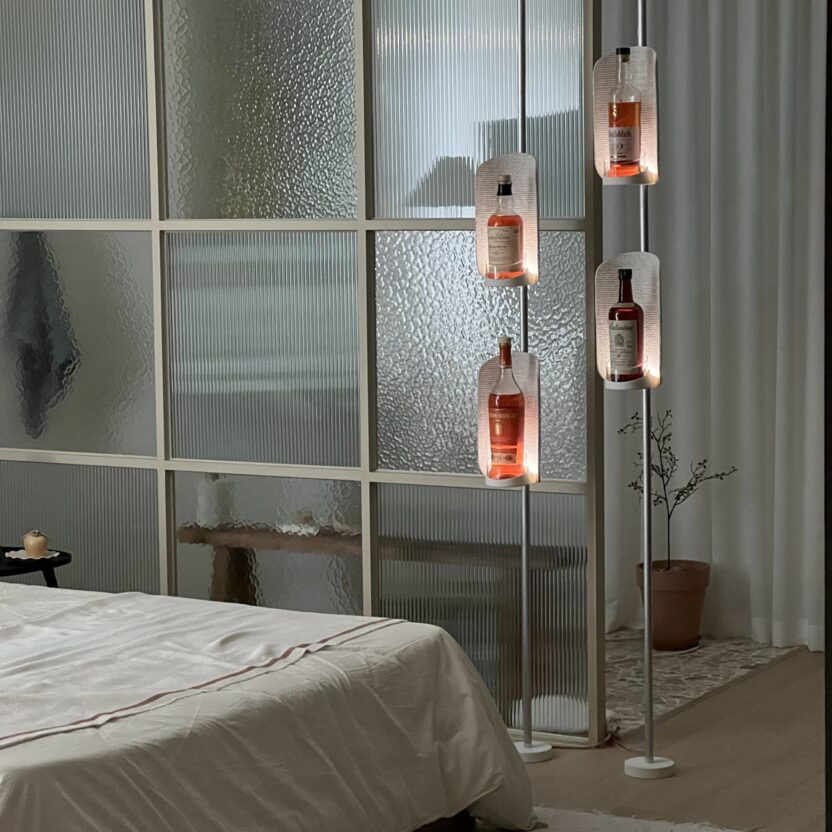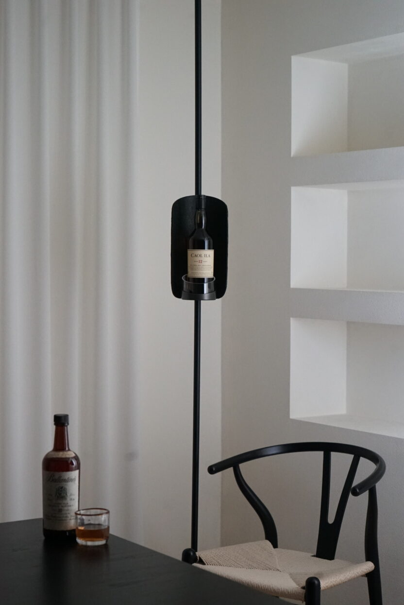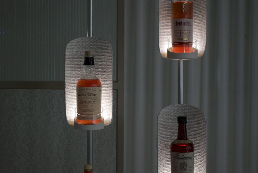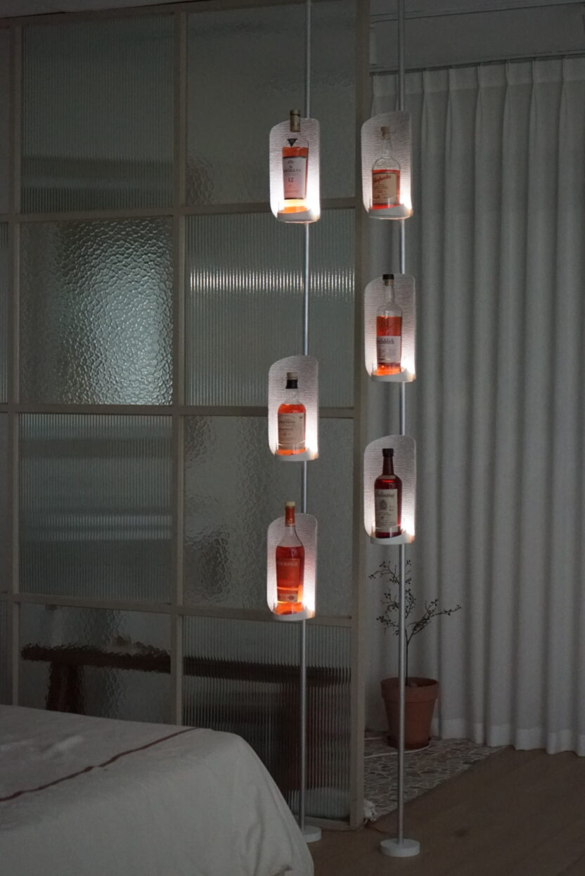 Sum은 위스키를 기록하고 즐기는 새로운 방식을 제안합니다. 위스키는 더 이상 고리타분한 취미가 아닙니다. 이젠 보다 가볍고 편안하게 즐길 수 있는 취미입니다. 이런 배경에서 원룸에 거주 중인 1.2인이 구가 위스키와 친해지는 방법을 제안했습니다. 작은 공간에서 점점 늘어가는 위스키를 보관할 수 있도록 모듈 시스템을 만들었습니다. 파이프는 천장 레일 조명과 같이 위아래로 길게 전원이 연결됩니다. 이를 통해 작은 플레이트를 파이프에 고정하면 플레이트에 전원이 들어와 조명을 켤 수 있게 됩니다. 사용자의 위스키 취미가 넓어지고, 집에 보관하는 위스키가 많아질수록 플레이트를 추가하며 위스키를 정리합니다. 각 플레이트의 전원 연결이 자유로우므로, 사용자가 플레이트의 위치를 자유롭게 고정할 수 있습니다. 목업의 패널은 지사벽지를 이용해 포근한 분위기로 제작했지만, 개인의 취향에따라 컬러, 형태, 소재를 선택하여 1인가구의 개성에 맞게 커스텀이 가능합니다.