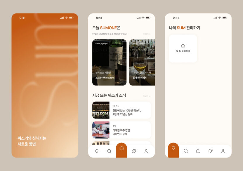 그리고 모듈과 연결되는 앱을 통해 사용자는 직접 조명의 조도와 색온도를 설정할 수 있습니다. 그리고 이를 앱의 커뮤니티에 공유함으로써 사용자 간의 상호작용을 만들었습니다. 그뿐만 아니라 커뮤니티에선 사용자 간 Sum을 꾸미는 방식을 서로 자랑하며, 교류합니다. 마지막으로, Sum이 제공하는 앱에선 위스키를 마시는 취향을 늘릴 수 있도록 도움을 주고 있습니다. 위스키를 정리한 모습을 찍어 앱에 위스키 취향을 입력합니다. 그럼, 앱은 개인의 취향을 바탕으로 위스키 또는 함께 즐길 수 있는 안주나 영화, 음악 등을 추천합니다. 그리고 시음기를 기록하며 자신의 취향을 정리하고, 이를 커뮤니티에 공유하며 취향을 확대합니다. 이렇게 Sum은 위스키를 마시는 방식부터, 정리하는 방식까지. 위스키와 친해지는 모든 순간을 도와줍니다.