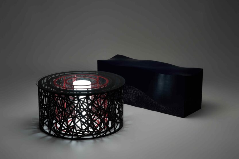 "뮤지컬 ’웃는 남자‘의 상처 속 희망을 담은 가구. 가시처럼 날카로운 현실 속에도, 상처받은 마음을 치유하며, 희망의 빛을 비추는 작품. 뮤지컬 ’웃는 남자‘의 환상을 담은 가구. 어려운 현실을 뒤로하고, 고래가 밤바다로 향하며 새로운 세상을 마주하는 것 같은 작품."