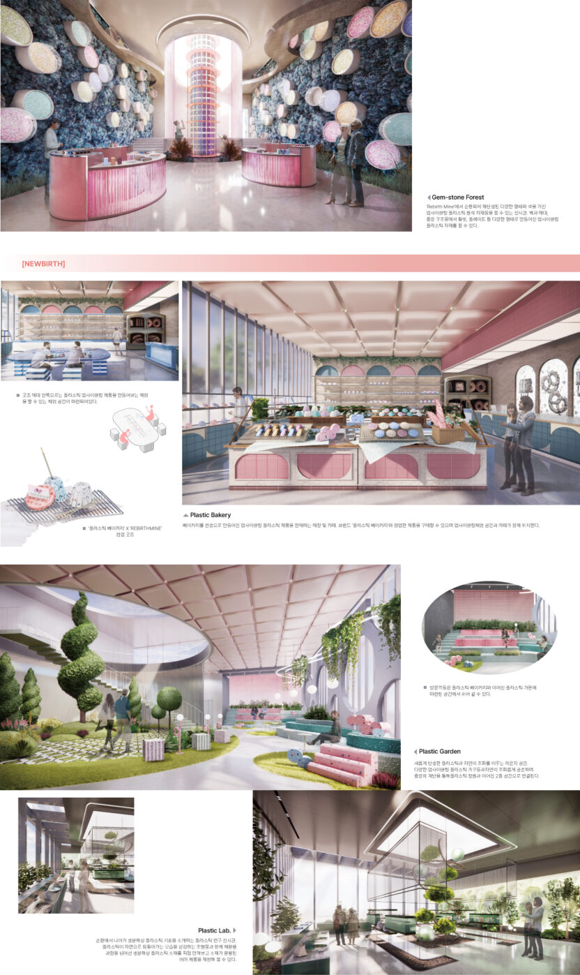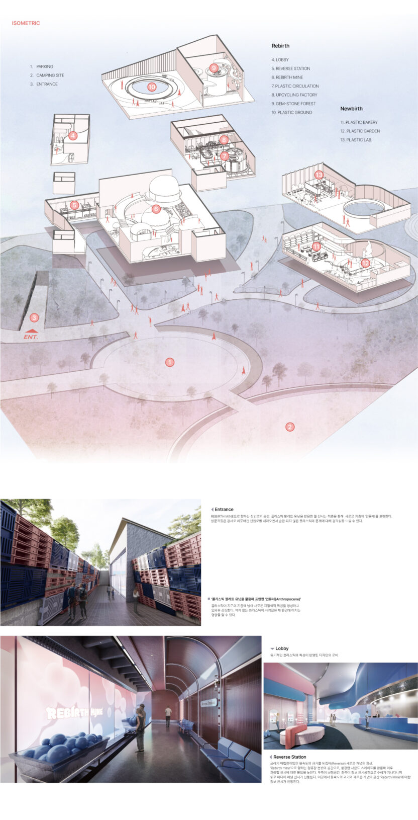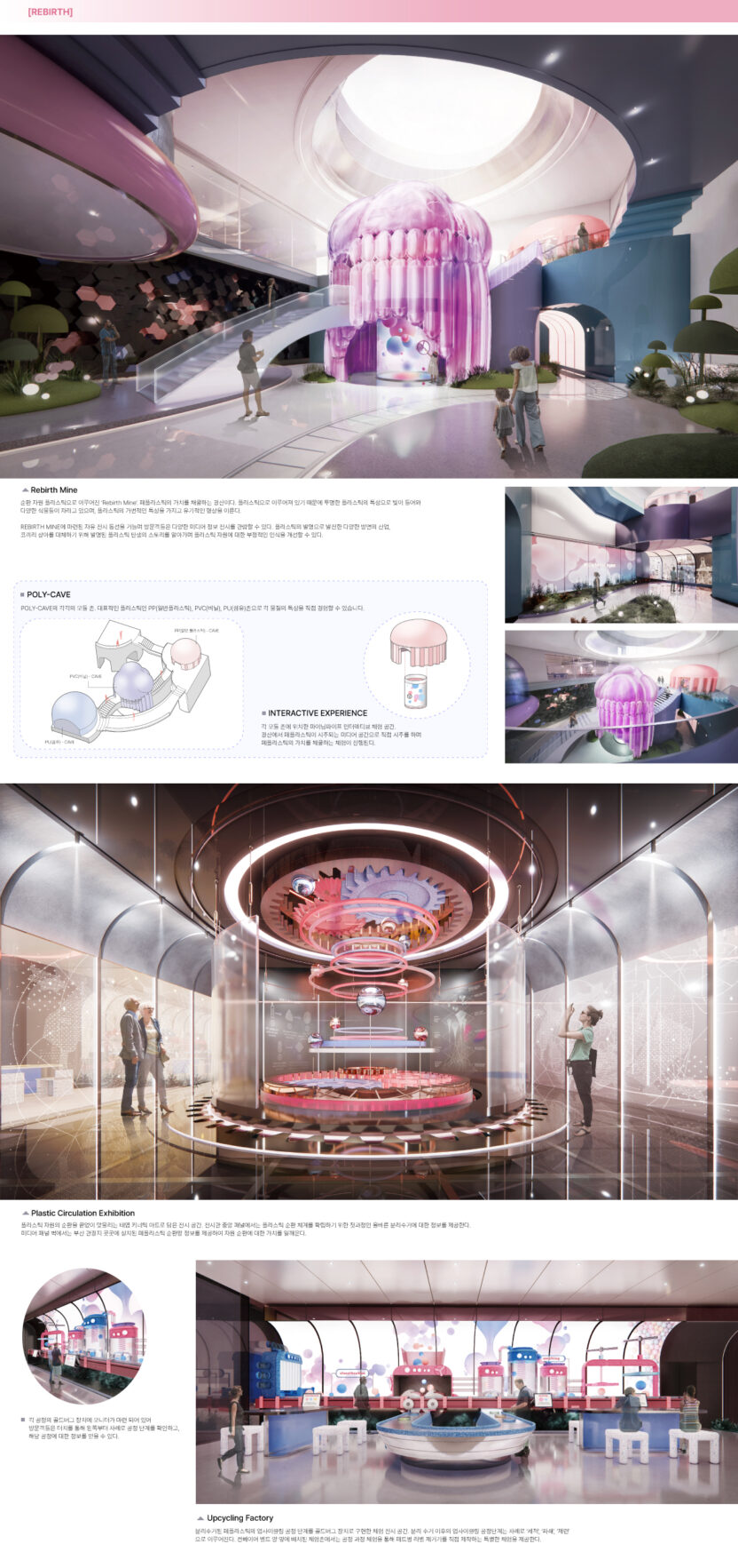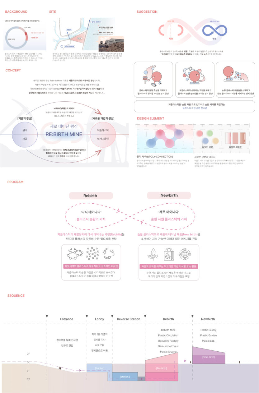 우리의 삶과 떨어질 수 없는 필수불가결 자원 플라스틱, 이에 대한 지속 가능한 대안이 필요하다. 플라스틱 제품의 일회적 사용을 '단절', 즉 환경 오염의 원인으로 인식하고 플라스틱을 ' 순환자원'으로 받아들여 올바른 재활용을 도모하는 것이 중요하다. 이를 통해 플라스틱 순환 체계를 확립할 수 있는 플라스틱 자원 순환 전시관 ‘Rebirth Mine’을 제안한다. 기존에 존재하는 광산에서의 채굴은 무분별하게 이루어질 때 자연이 파괴되며 부정적인 결과를 초래하지만, 새로운 개념의 광산 ‘Rebirth Mine’에서는 이곳의 원석인 ‘폐플라스틱 가치’를 업사이클링을 통해 채굴하며 친환경적 자원순환의 개념을 담아 독특한 경험을 제공하는 전시관으로 플라스틱 순환의 중요성을 알리고자 한다.