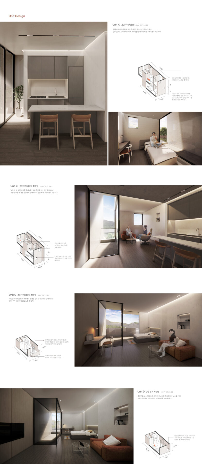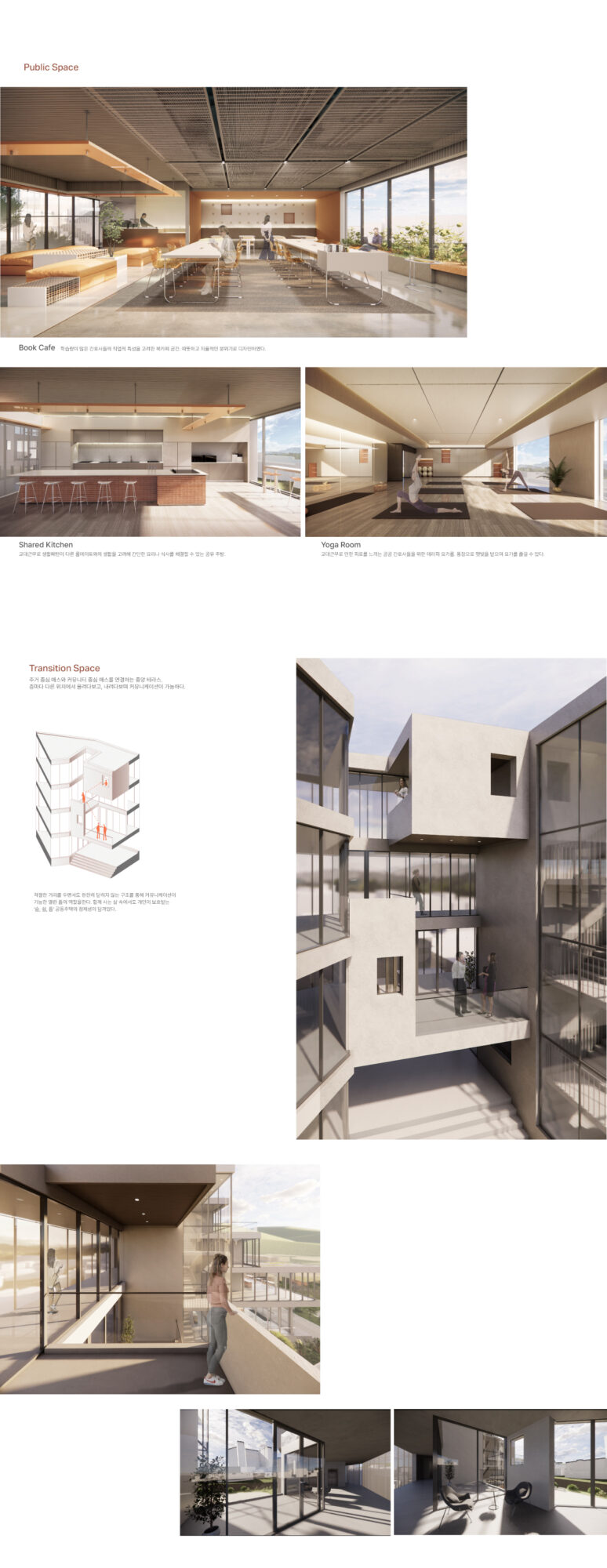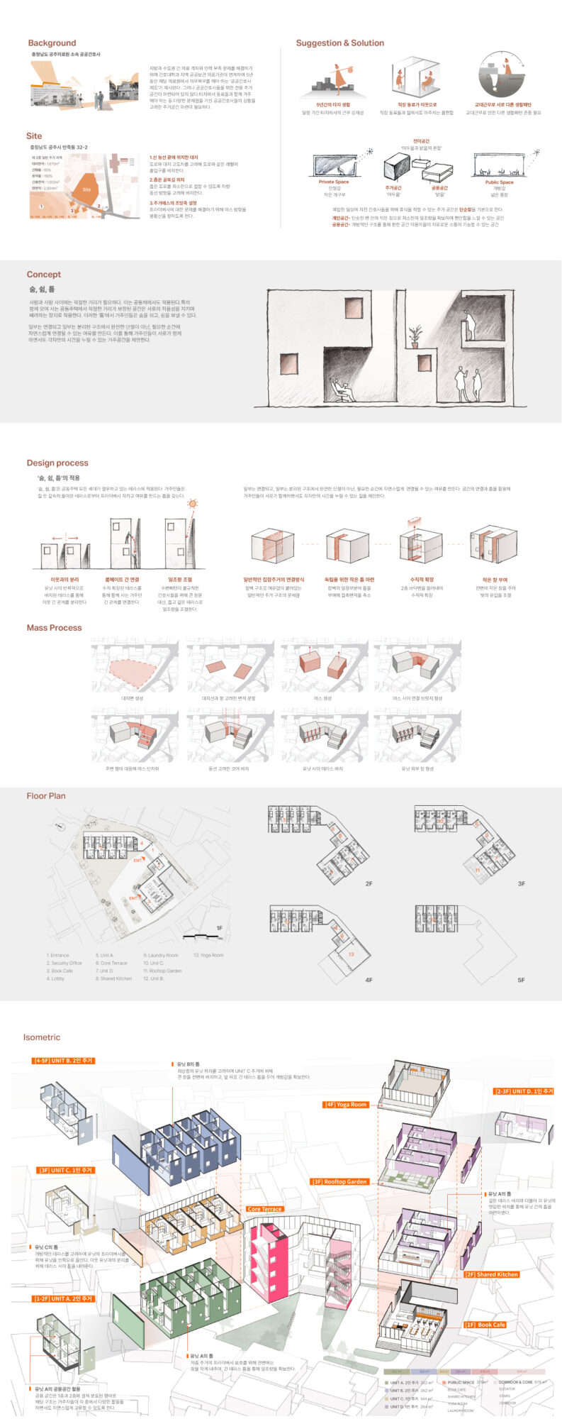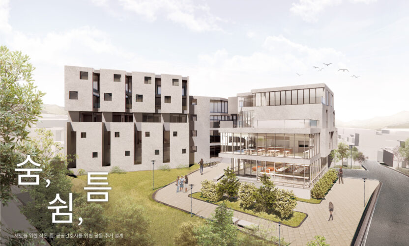 사람과 사람 사이에는 적절한 거리가 필요하다. 이는 공동체에서도 적용된다. 특히 함께 모여 사는 공동주택에서 적절한 거리가 보장된 공간은 서로의 자율성을 지키며 배려하는 장치로 작용한다. 이 프로젝트는 공공간호사를 위한 새로운 주거 공간을 제안한다. 공공간호사들은 타지에서 근무하며, 교대 근무의 높은 업무 강도와 동료들과 공동 생활을 해야 하는 특수한 환경 속에 있다. 고된 일상을 보내는 공공간호사에게 휴식과 안식을 극대화할 수 있는 주거 공간을 마련하고자 한다. 이를 위해 제안하는 ‘틈’에서 거주민들은 숨을 쉬고, 쉼을 보낼 수 있다. 일부는 연결되고 일부는 분리된 구조에서 이용자들은 완전한 단절이 아닌, 필요한 순간에 자연스럽게 연결될 수 있는 여유를 갖는다. 이를 확장하여 현대인의 쉼과 회복을 지원하는 공간의 역할을 제안하고자 한다.