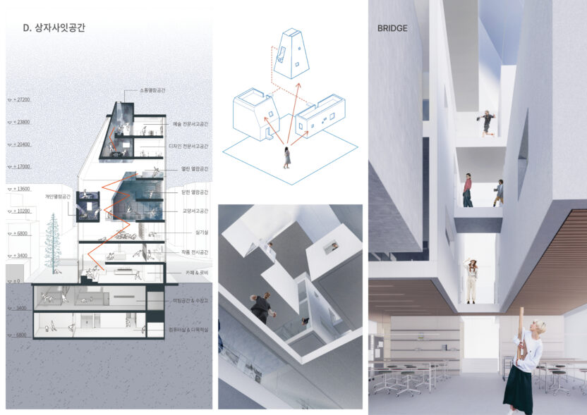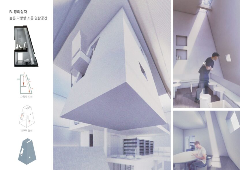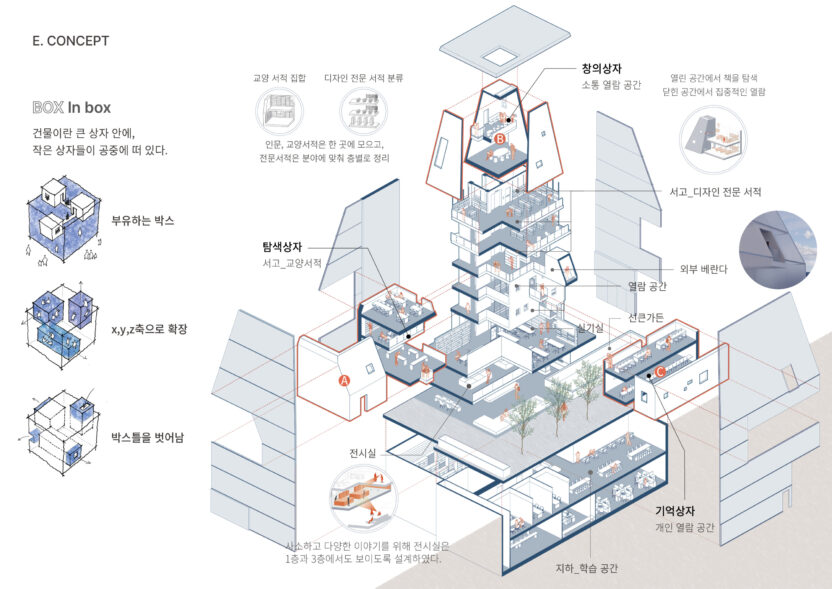 E- 상자 ‘안’이라는 닫힌 공간과 그 ‘밖’의 열린 공간에서 사람들의 다양한 행위와 모습을 경험하며 시야를 넓게 열어준다. 그로 인해 생겨나는 사회적 관계와 자연적 관계가 쌓여 창의적 사고를 표현하는 공간을 만들고자 한다. 부유하는 박스-BOX를 공중에 띄워, 단순한 형태인 건물을 겉에서 보는 것과 다른 작고 분리된 모양의 내부 형성 x,y,z축으로 확장-여러 축으로 확장된 상자에 다양한 공간감을 부여하며, 안에서의 행위도 달라진다. 박스들을 벗어남-외부환경과의 관계를 위해 박스의 틀을 벗어나 튀어나가기도, 반대로 파여들어오기도 한다. 분해 아이소 메트릭을 표현한 이미지는 내부의 박스와 다른 공간의 관계성과 외부와의 관계를 전체적으로 보여준다.