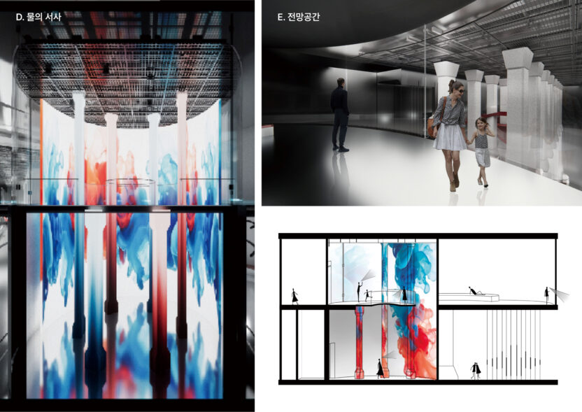 E-전망공간:지하 1층에 위치한 영상관 뒤편의 전망 공간에서는 높은 기둥의 대심도 빗물터널을 재현한 공간을 내려다볼 수 있게 설계하여, 양면에서 전시관과 영상관을 동시에 마주하며 그 흐름을 직접적으로 체감할 수 있도록 디자인했다.
