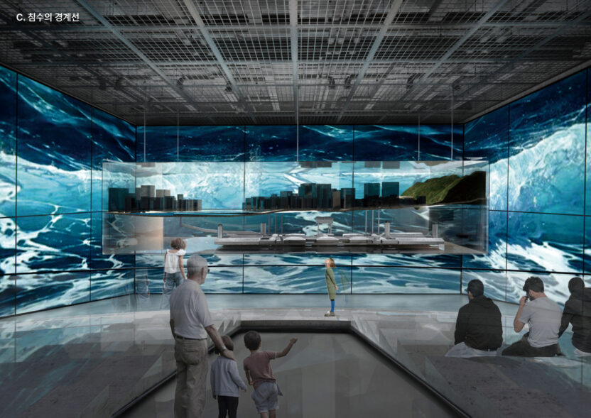 C-침수의 경계선:도시모형과 물이 차오르는 미디어 영상을 통해 대심도 빗물터널이 생기기 전의 침수 위험성을 시각적으로 체험할 수 있는 공간이다.