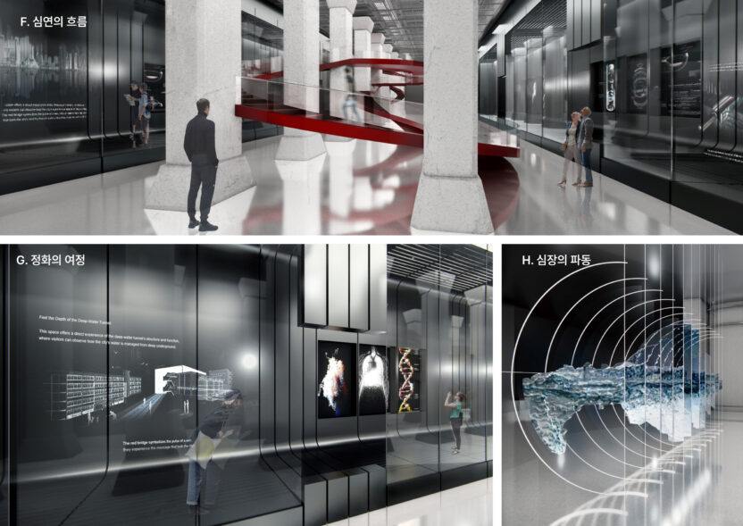 H-심장의 파동:대심도 빗물터널의 핵심인 펌프는 파이프를 형상화한 전시 구조물로 표현되었으면 여러 겹의 레이어로 물이 펌프로 흐르는 모습을 시각적으로 체험할 수 있도록 설계되었다.