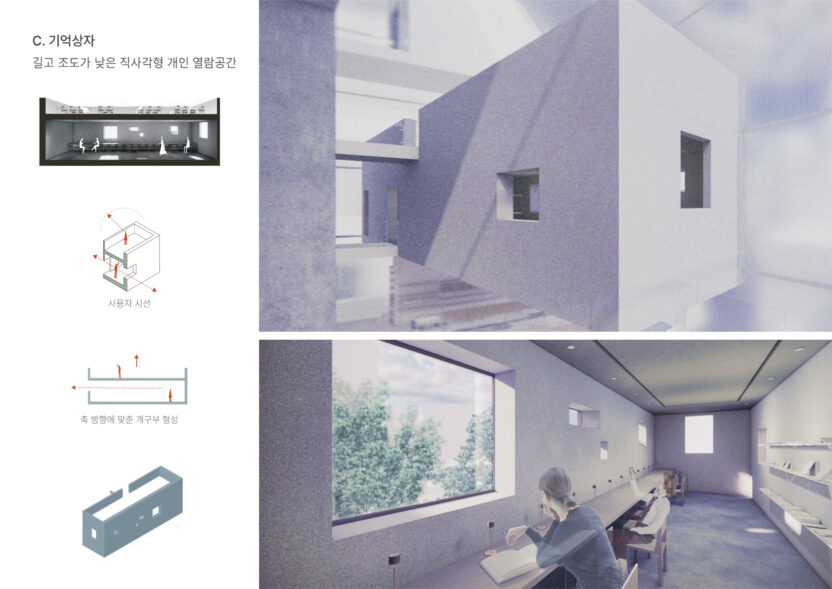 C- 소통을 제한하고 방해 없이 몰입하여 집중할 수 있는 열람 공간이다. 가로로 길어 천장이 더 낮아 보이며, 천장높이가 낮아지면 집중을 잘하게 된다. 크기가 다르게 뚫린 개구부는 다양한 액자로써 풍경을 담는 연출을 한다.