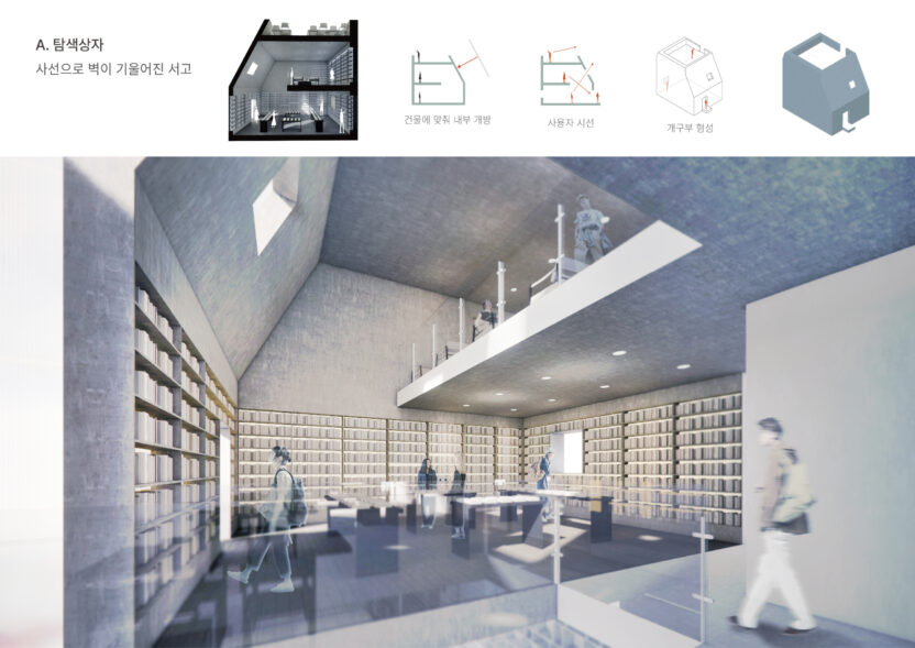 A - 교양 서적을 한눈에 바라볼 수 있는 공간으로, 고개를 들면 사선의 벽면과 정사각형으로 뚫린 작은 창은 안에서 밖을 바라보고, 세로로 긴 개구부는 아예 나가서 개방감 있는 공간을 전망할 수 있다.