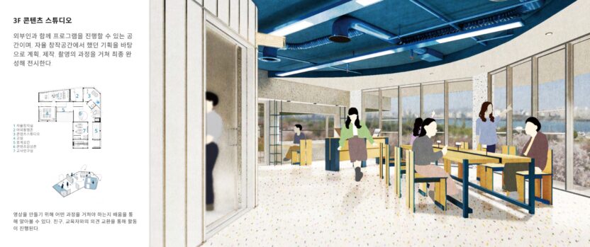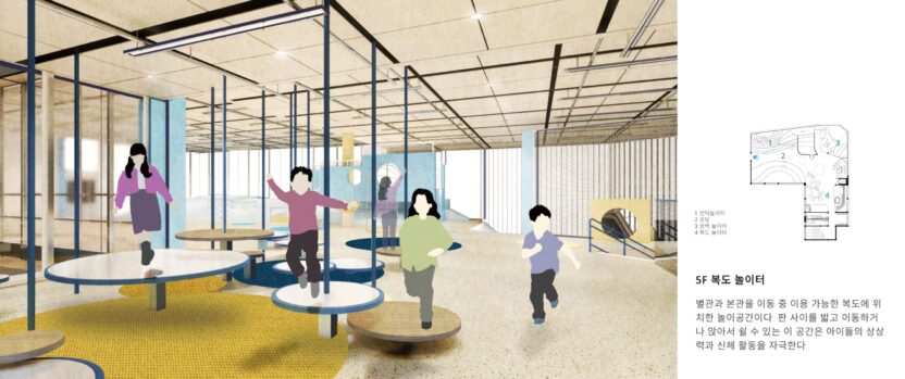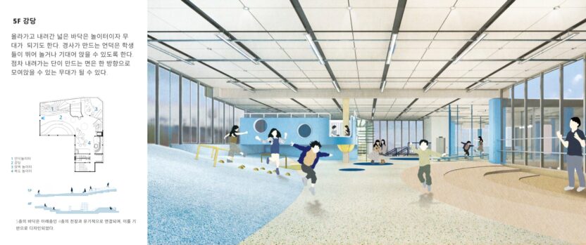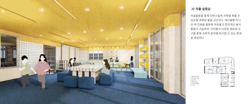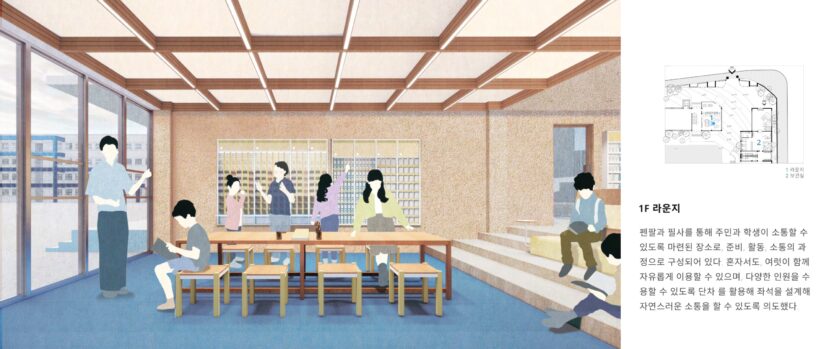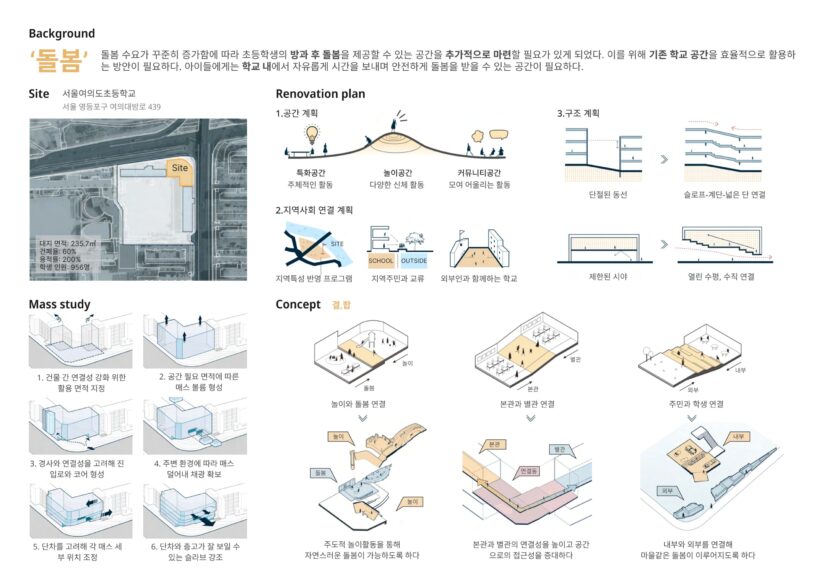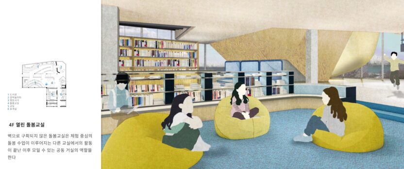 학교는 배움의 공간이자 아이들이 대부분의 시간을 보내는 일상의 장소이며 돌봄교실을 이용하는 아이들은 학교에 머무는 시간이 더 많다. 기존 돌봄교실은 아이들을 보호하는 보육 측면으로 운영되고 있지만, 학교라는 장소에 돌봄이라는 자유로운 시간이 더해지면 아이들에게 학교는 지금보다 더욱 즐겁고 다양한 활동이 가능한 공간이 될 수 있을 것이다. 돌봄의 공간이 기존 학교 건물과 어떻게 연결되며 어떤 공간으로 기능할 것인지, 이러한 공간에서 아이들이 어떤 다양한 활동을 할 수 있을 것인지에 대해 이야기 하고자 한다.