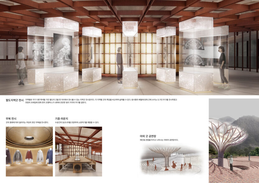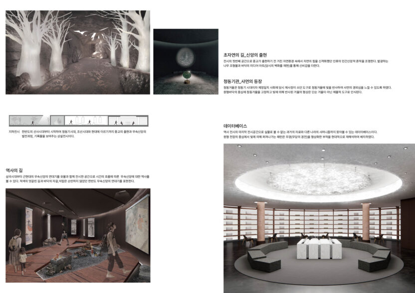 한국의 무속신앙은 고대부터 현대에 이르기까지 크고 작은 역할을 통해 우리의 곁을 함께 해왔다. 주로 국가와 민간의 심리적 치유와 해소를 도우며 이를 완수하는 과정에서 발생하는 행위들은 우리나라의 문화사에서 큰 축을 이루고 있다. 반면 현대의 무속신앙은 일부 자극적인 장면만을 보여주는 미디어로 인해 대중들로 하여금 그 근본적인 가치를 느끼게 할 기회가 부족하였고 무형 자산의 특성 상 이를 통합하여 축적 가능한 형태로 보존하는 시스템이 미흡하였다. 따라서 무속신앙의 본질적 가치를 다시 알고 이를 보존할 수 있는 무속신앙 전시 및 사료의 아카이빙 공간을 제안한다.