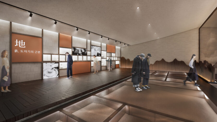 3. 地의 공간: 도자기의 기본 재료인 흙을 전시하며, 도자기의 종류에 따라 흙의 종류가 어떻게 달라지는지 보여준다.