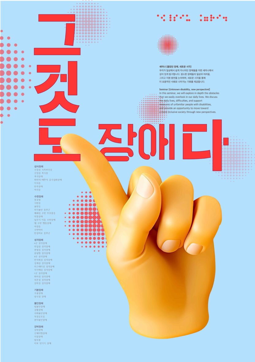외형적 장애만 장애로 보는 선입견에 대해 주목했다. 따라서 겉으로는 잘 모를 수 있는 내면적 장애들을 조명하고자 한다. 이 포스터의 큰 손가락은 그것을 가리키고 있고, 그 밑에는 내면적 장애들이 나열되어 있다.