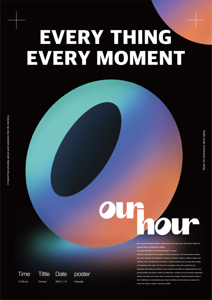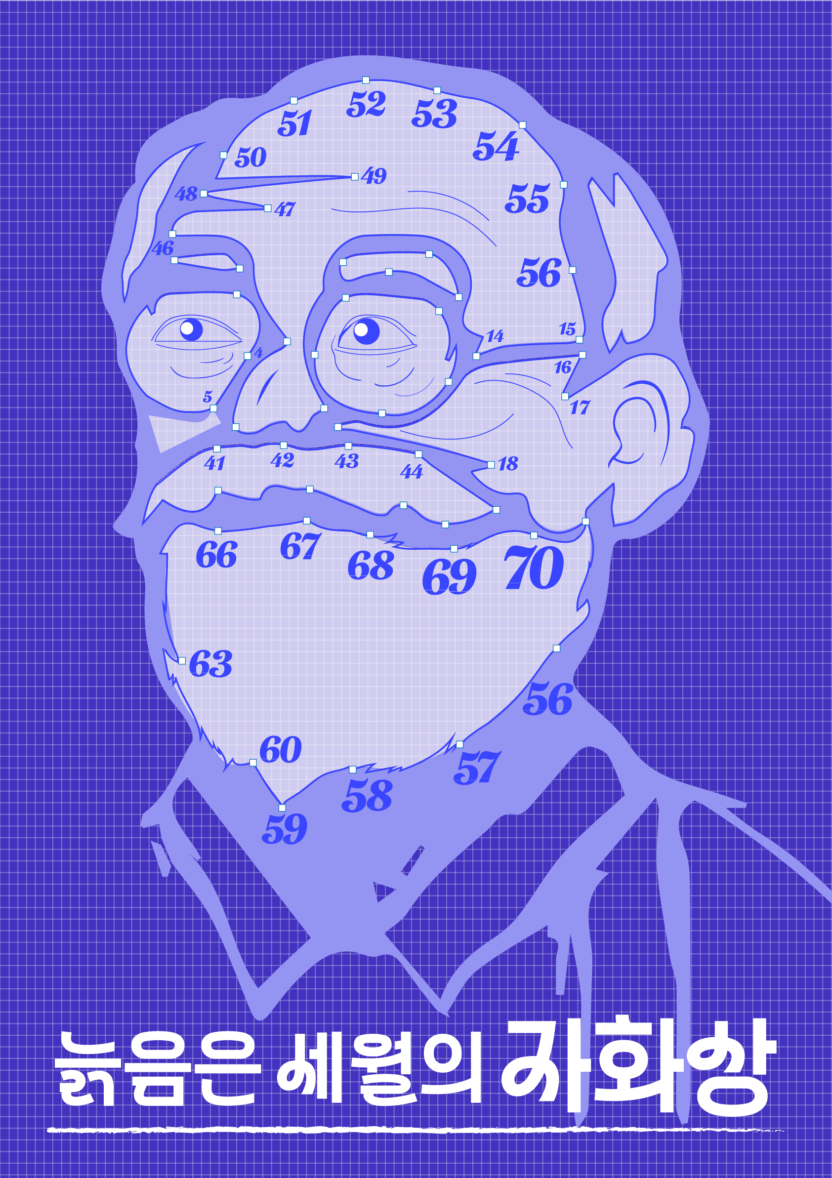 시간의 흐름 속에서 나 자신이 완성되어 가는 과정을 나타낸 포스터입니다. 관객이 직접 점을 잇는 과정을 통해 점진적으로 자화상을 완성해가며, 나이 들어가는 과정을 함께 경험할 수 있습니다.