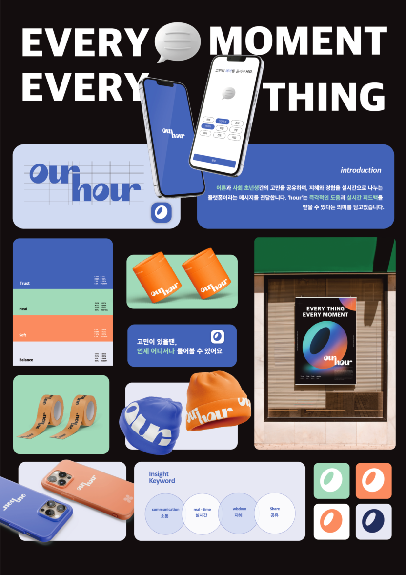 로고 아이콘을 활용하여 디자인한 아트 포스터. 로고 디자인에서 알파벳 ‘O’는 단순한 글자를 넘어 사용자들의 이야기를 담는 바구니로서의 역할을 합니다. 둥근 형태는 열린 공간을 상징하며, 복잡한 고민이든 소소한 생각이든 누구나 자유롭게 담을 수 있는 포용적인 어른의 모습을 상징합니다. ‘O’라는 바구니에 담긴 모든 이야기는 서로 연결되며 하나의 공동체 속에서 소중히 간직된다는 메시지를 전달하며 브랜드의 4가지 컬러를 담긴 O로 완성되었습니다.