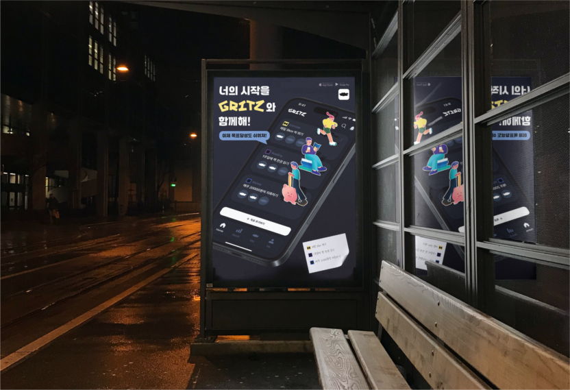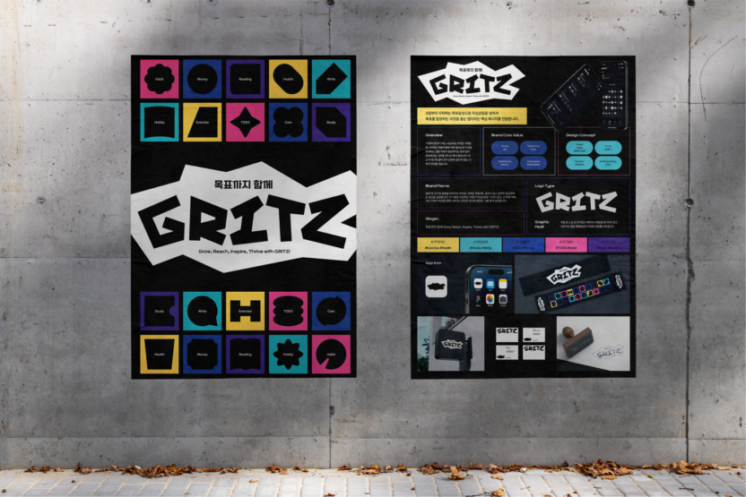 사용자가 포기하지 않고 목표를 끝까지 달성할 수 있도록 돕는 GRITZ 앱을 홍보합니다. 포스터는 GRITZ 앱의 UI를 중심으로, 운동, 독서, 저축 등 다양한 사용자 맞춤형 목표로 각 목표는 팝업 형식의 일러스트로 나타내어, 앱에서 관리 중인 목표가 단순한 리스트를 넘어 생동감 있는 구체적인 목표로 시각화했습니다.