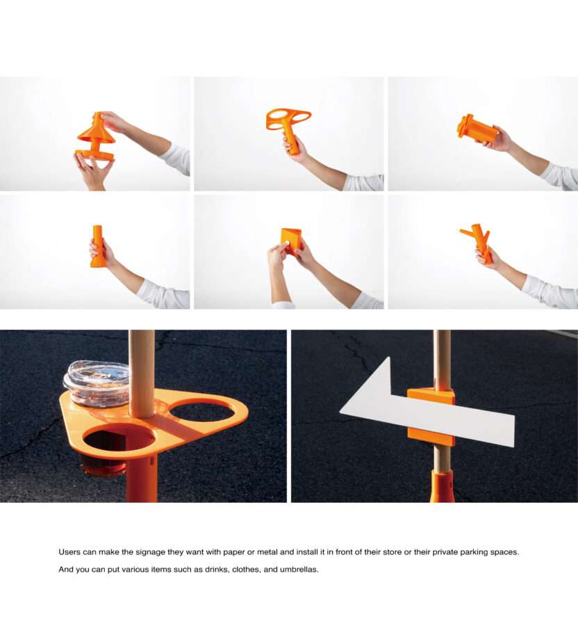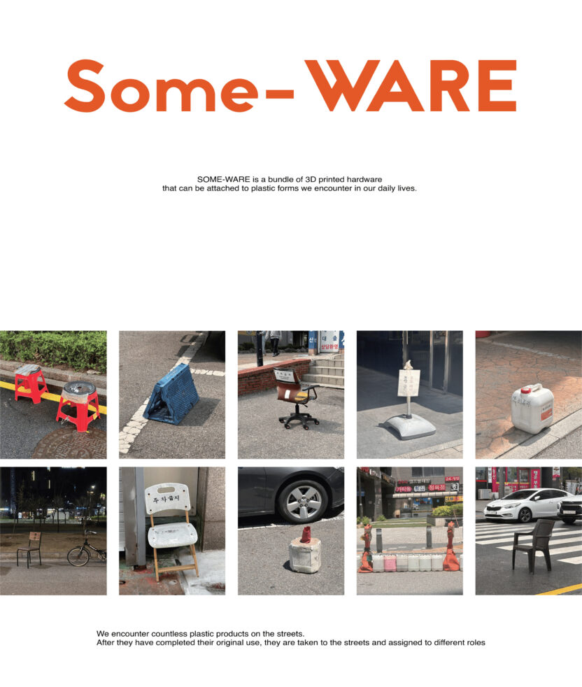 아스팔트 바닥과 건물이 만나는 지점, 그 곳에서 우린 수많은 플라스틱 사물들을 발견할 수 있다. 한 곳에선 주차 금지 표지판으로, 또 다른 곳에선 배너가 날아가지 않게 잡아주는 무게추로. Some-ware는 어디에나 있지만 평범한 일상 속에 숨어 우리가 미처 인지하지 못했던 사물들에게 새로운 사용성을 부여한다.