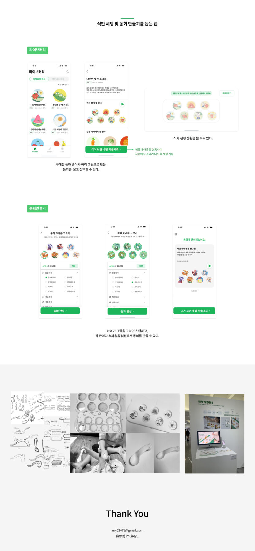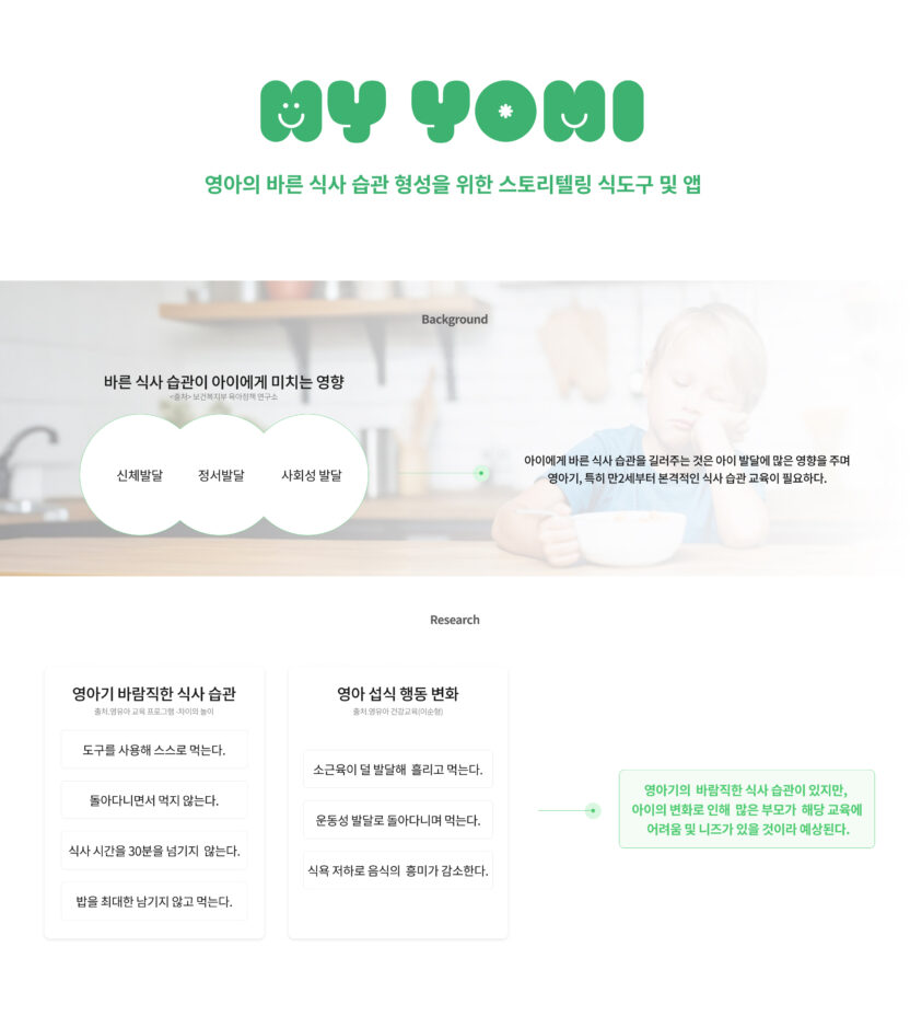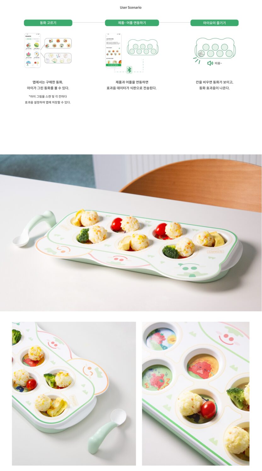영아에게 바른 식사 습관을 길러주는 것은 중요하지만, 실제로 많은 부모는 이러한 교육에 어려움을 겪고 있다. 이에 아이가 식사에 흥미를 잃지 않고, 불편함 없이 재미있게 식사하도록 ‘마이요미’라는 제품-앱 서비스를 제안하고자 한다. 스토리텔링을 이용해 식사에 흥미를 갖도록 하는 인터렉티브 식판, 식판의 세팅을 도와주는 앱, 영아의 손에 맞춰진 수저로 구성되어 있다. 부모는 식사 전에 동화 종이를 식판에 끼우고, 앱에서 해당 동화를 선택한다. 그리고 식판과 앱을 연결하여 식판에서 소리가 나도록 세팅한다. 식판을 한 칸씩 비울 때마다 동화가 보이고, 동화에 맞는 재미있는 소리가 난다. 식판을 모두 비우면 칭찬 음성이 나와 아이에게 성취감까지 준다. 그리고 아이는 안정적으로 수저를 잡고 식사할 수도 있다. 이후 앱에서 동화 종이를 구매하거나, 빈 종이에 아이가 그린 그림을 앱으로 스캔하여 아이의 동화를 만들 수도 있다.
