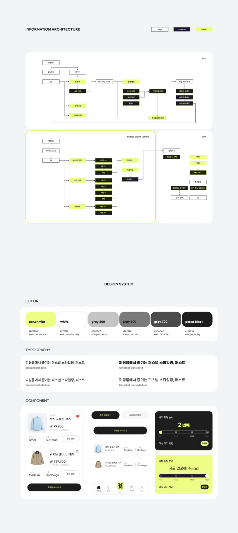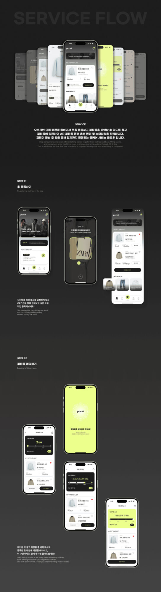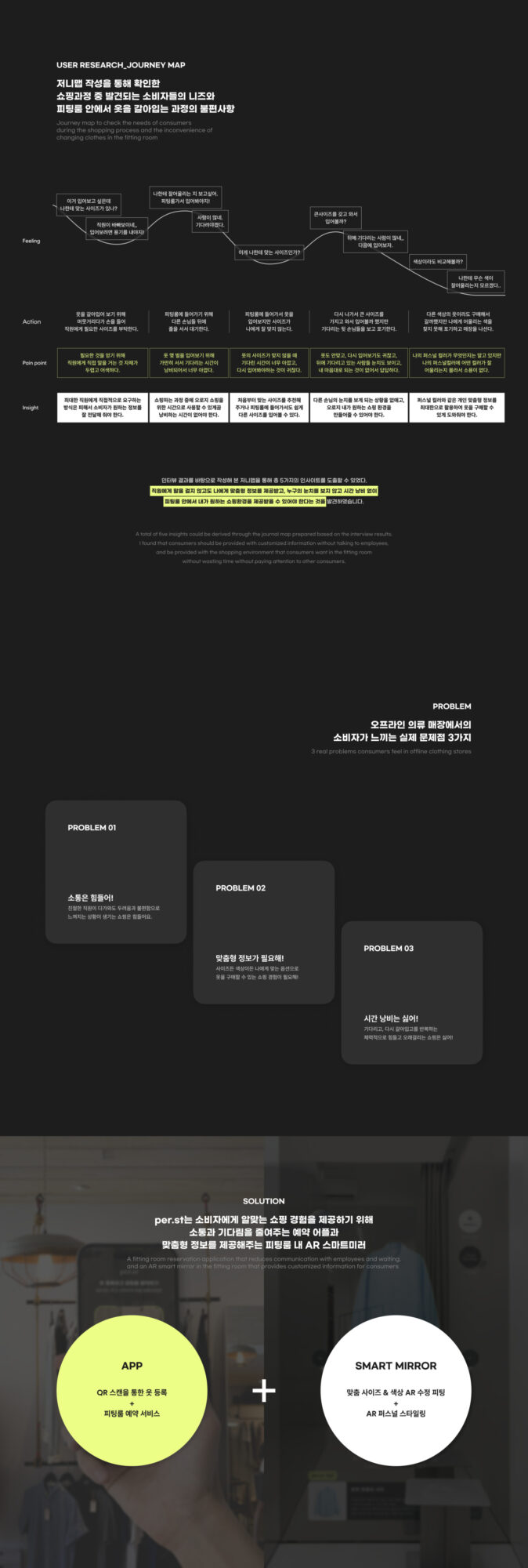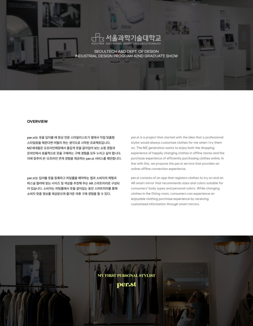 per.st는 옷을 입어볼 때 항상 전문 스타일리스트가 옆에서 직접 맞춤형 스타일링을 해준다면 어떨지 하는 생각으로 시작된 프로젝트이다. MZ세대들은 오프라인매장에서 즐겁게 옷을 갈아입어 보는 쇼핑 경험과 온라인에서 효율적으로 옷을 구매하는 구매 경험을 모두 누리고 싶어 한다. 이에 맞추어 온-오프라인 연계 경험을 제공하는 per.st 서비스를 제안한다. per.st는 (1) 입A어볼 옷을 등록하고 피팅룸을 예약하는 앱과 (2) 소비자의 체형과 퍼스널 컬러에 맞는 사이즈 및 색상을 추천해 주는 AR 스마트미러로 구성되어 있다. 소비자는 피팅룸에서 옷을 갈아입는 동안 스마트미러를 통해 소비자 맞춤 정보를 제공받으며 즐거운 의류 구매 경험을 할 수 있다.