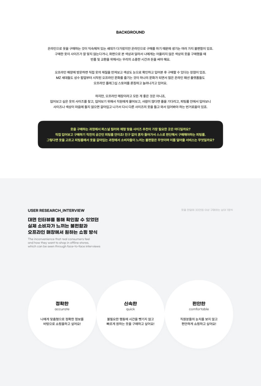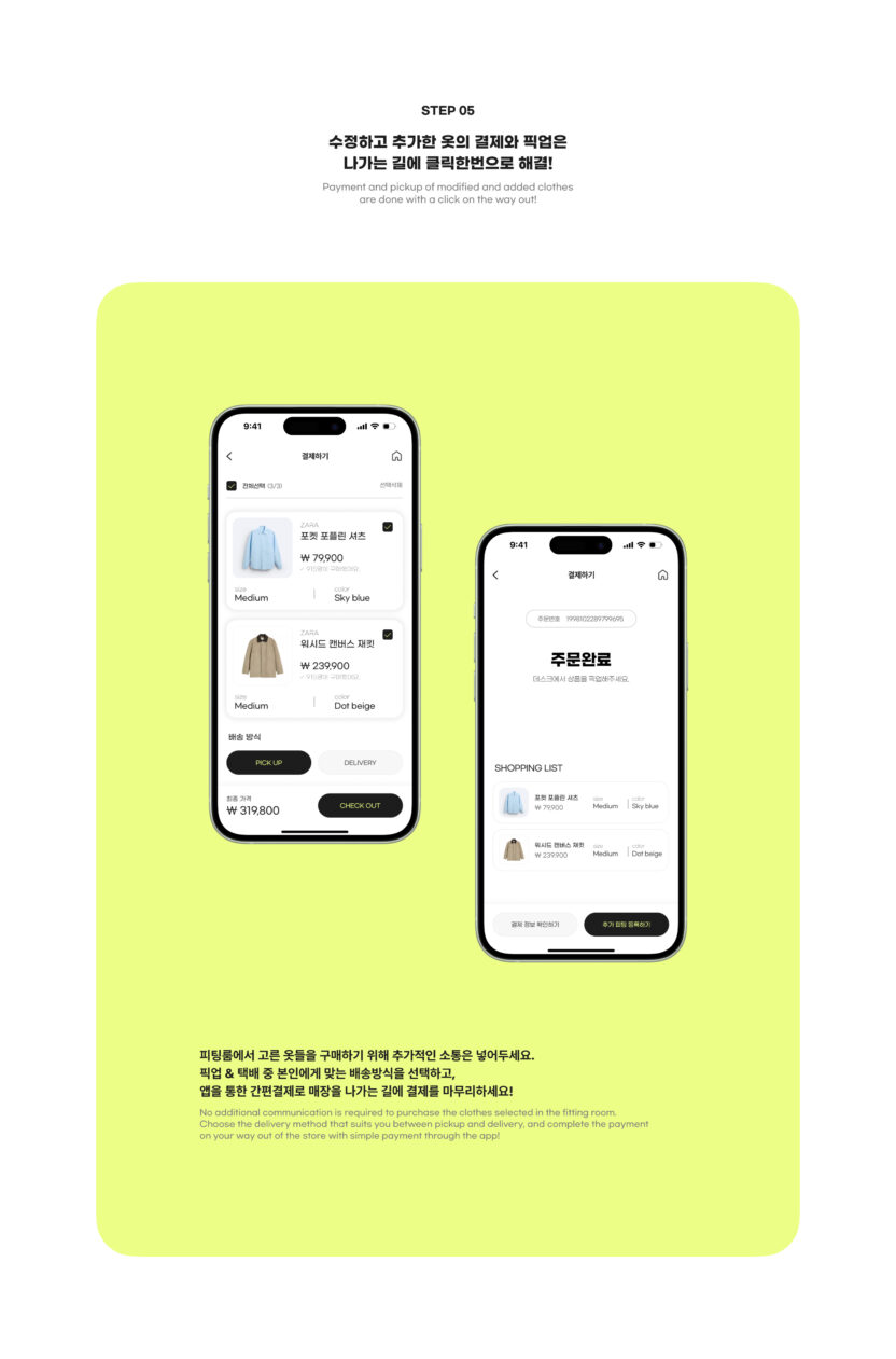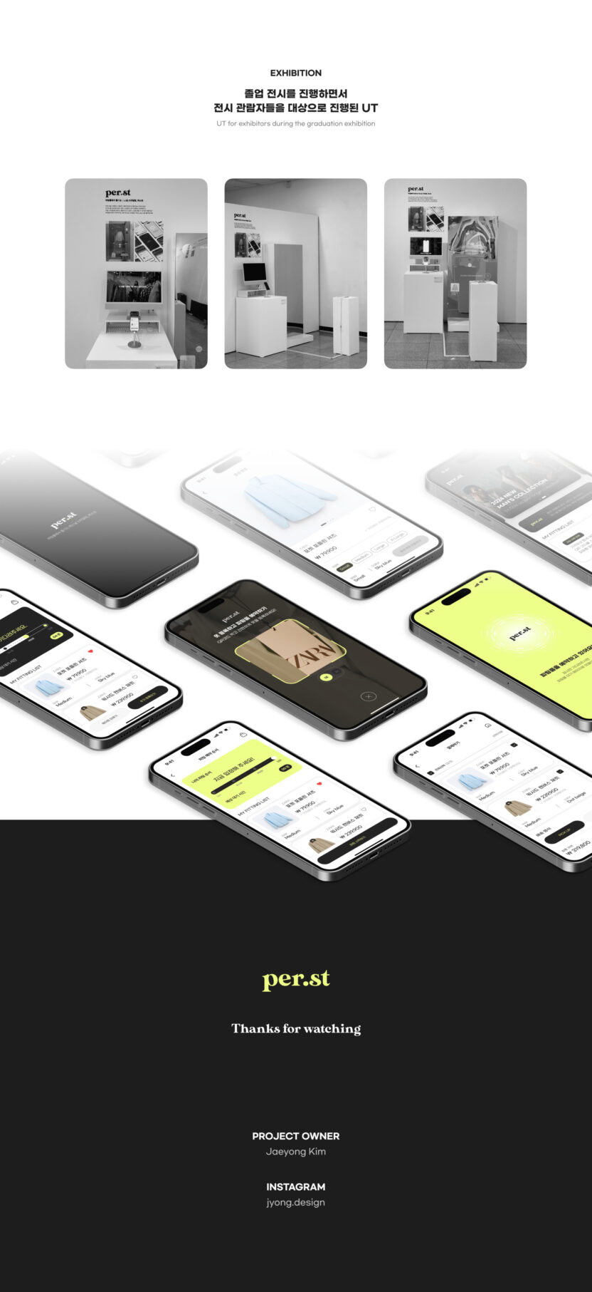 per.st는 옷을 입어볼 때 항상 전문 스타일리스트가 옆에서 직접 맞춤형 스타일링을 해준다면 어떨지 하는 생각으로 시작된 프로젝트이다. MZ세대들은 오프라인매장에서 즐겁게 옷을 갈아입어 보는 쇼핑 경험과 온라인에서 효율적으로 옷을 구매하는 구매 경험을 모두 누리고 싶어 한다. 이에 맞추어 온-오프라인 연계 경험을 제공하는 per.st 서비스를 제안한다. per.st는 (1) 입A어볼 옷을 등록하고 피팅룸을 예약하는 앱과 (2) 소비자의 체형과 퍼스널 컬러에 맞는 사이즈 및 색상을 추천해 주는 AR 스마트미러로 구성되어 있다. 소비자는 피팅룸에서 옷을 갈아입는 동안 스마트미러를 통해 소비자 맞춤 정보를 제공받으며 즐거운 의류 구매 경험을 할 수 있다.
