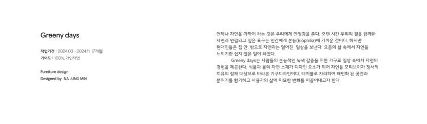 언제나 자연을 가까이하는 것은 우리에게 안정감을 준다. 오랜 시간 우리의 곁을 함께한 자연과 연결되고 싶은 욕구는 인간에게 본능(Biophilia)에 가까운 것이다. 하지만 현대인들은 집 안, 밖으로 패턴화된 일상을 보낸다. 요즘의 삶 속에서 자연을 느끼기란 쉽지 않은 일이 되었다. Greeny days는 사람들의 본능적인 녹색 갈증을 위한 가구로 일상 속에서 자연의 경험을 제공한다. 식물과 물의 자연 소재가 디자인 요소가 되어 자연을 모티브이자 정서적 치유의 잠재 대상으로 바라본 가구 디자인이다. 테이블로 자리하여 패턴화된 공간과 분위기를 환기하고 사용자의 삶에 미묘한 변화를 이끌어내고자 한다.