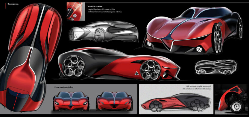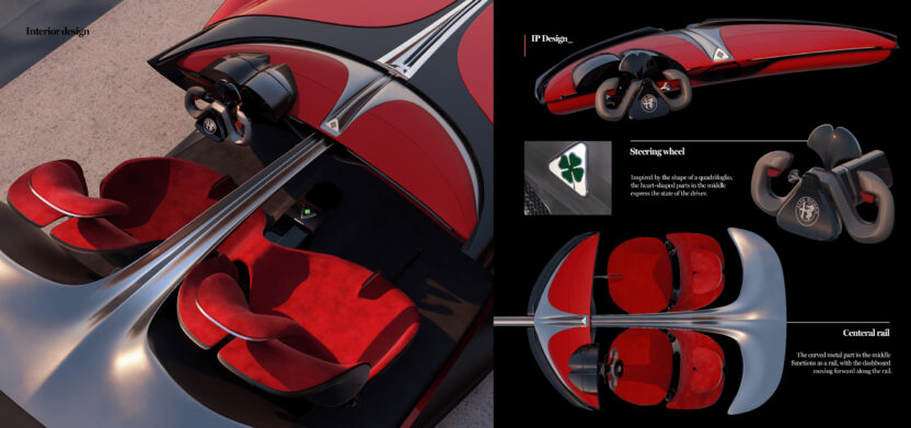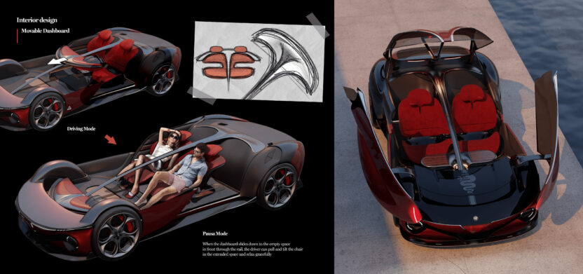 오랜 시간 2 seater 쿠페는 럭셔리와 스포티함의 상징이었다. 그러나 2 seater 쿠페는 디자인과 퍼포먼스를 위해 실내 공간을 희생해야 했다. 이에 따라 주행 중에는 럭셔리함을 느낄 수 있지만, 차 안에서 휴식을 취할 때는 불편한 자세로 머물러야 했다. Alfa Romeo Pausa는 '주행과 휴식을 모두 럭셔리하게 즐길 수 없을까?'라는 질문에서 시작되었다. Alfa Romeo Pausa는 주행 중에는 일반적인 스포츠 쿠페의 실루엣과 비율을 유지한다. 주행을 마치고 휴식을 취할 때는 차체를 확장하여 새로운 아키텍처를 만들어낸다. 이를 통해 운전자는 넓고 우아한 공간에서 여유롭게 휴식을 즐길 수 있다.