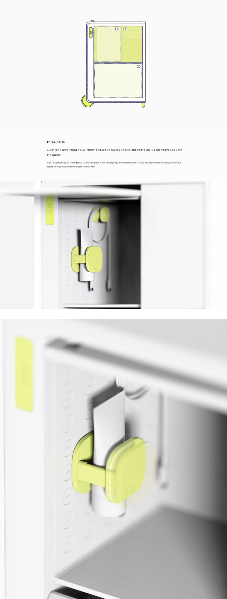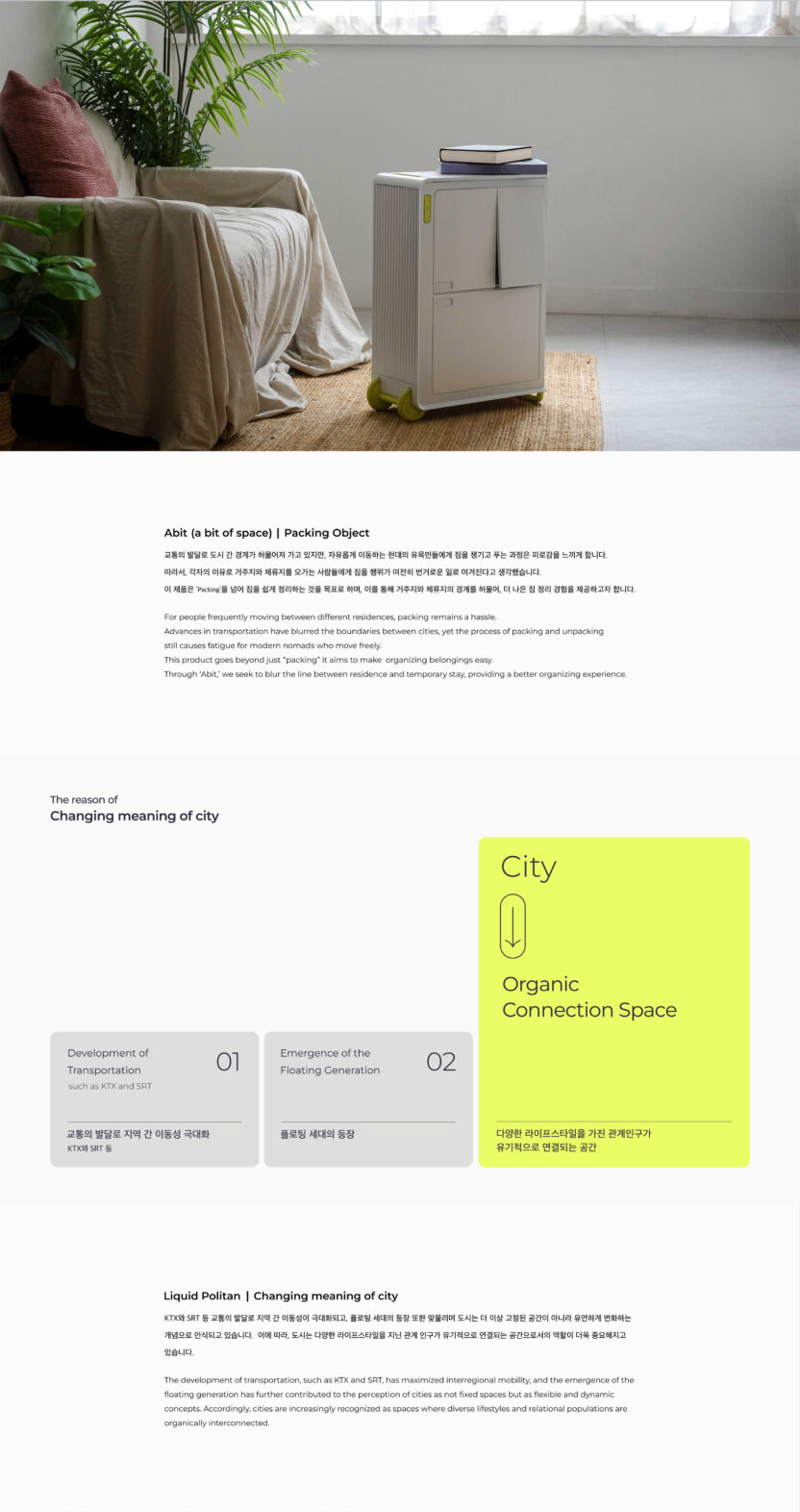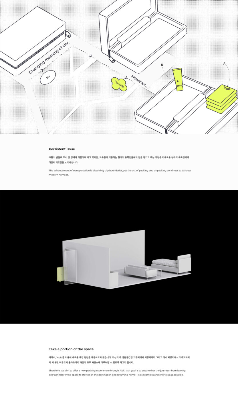 각자의 이유로 거주지와 체류지를 오가는 사람들에게 짐을 챙기는 일은 여전히 번거로운 일이다. 교통의 발달로 도시 간 경계가 허물어져 가고 있지만, 자유롭게 이동하는 현대의 유목민들에게 짐을 챙기고 푸는 과정은 피로감을 느끼게 한다. 이 제품은 ‘Packing’을 넘어 짐을 쉽게 정리하는 것을 목표로 한다. ‘Abit’을 통해 거주지와 체류지의 경계를 허물며, 더 나은 짐 정리 경험을 제공하고자 한다.
