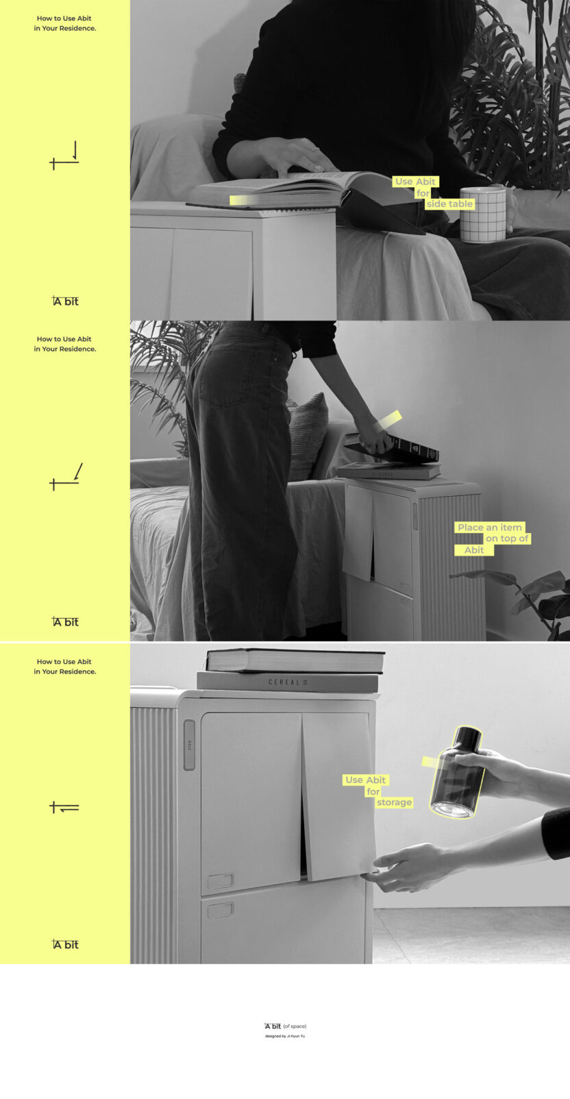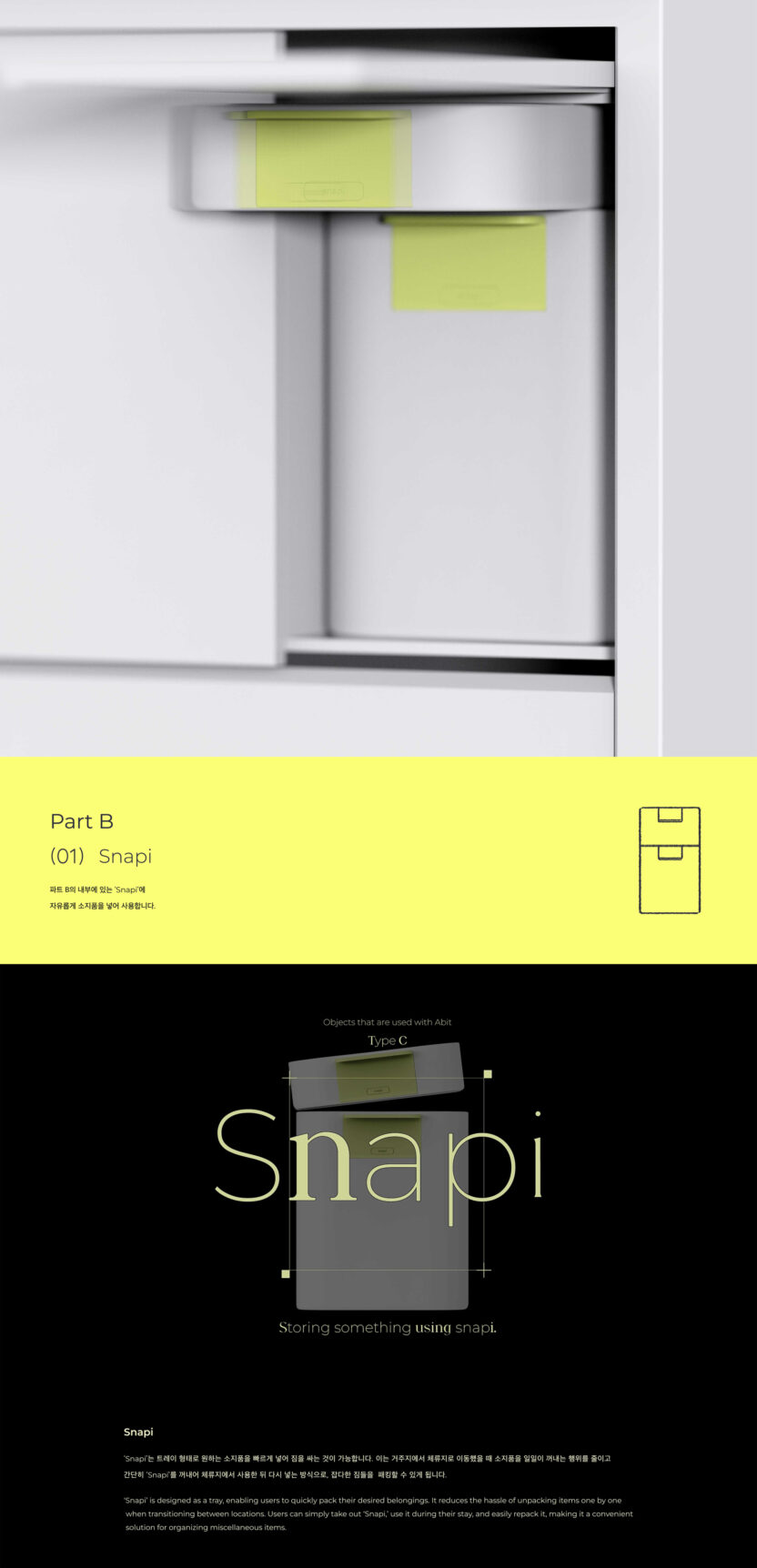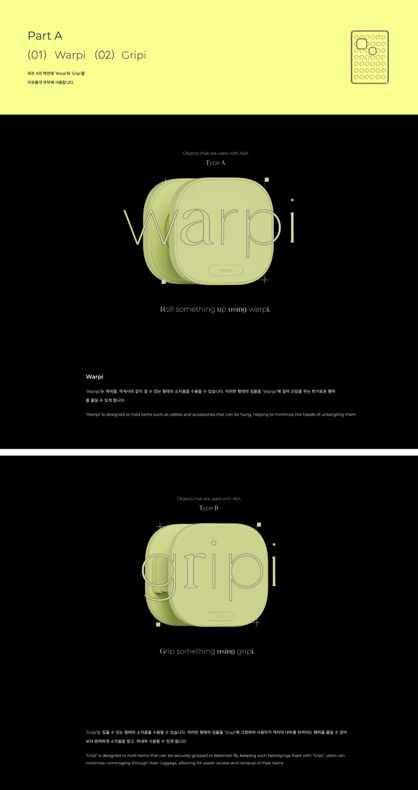 각자의 이유로 거주지와 체류지를 오가는 사람들에게 짐을 챙기는 일은 여전히 번거로운 일이다. 교통의 발달로 도시 간 경계가 허물어져 가고 있지만, 자유롭게 이동하는 현대의 유목민들에게 짐을 챙기고 푸는 과정은 피로감을 느끼게 한다. 이 제품은 ‘Packing’을 넘어 짐을 쉽게 정리하는 것을 목표로 한다. ‘Abit’을 통해 거주지와 체류지의 경계를 허물며, 더 나은 짐 정리 경험을 제공하고자 한다.