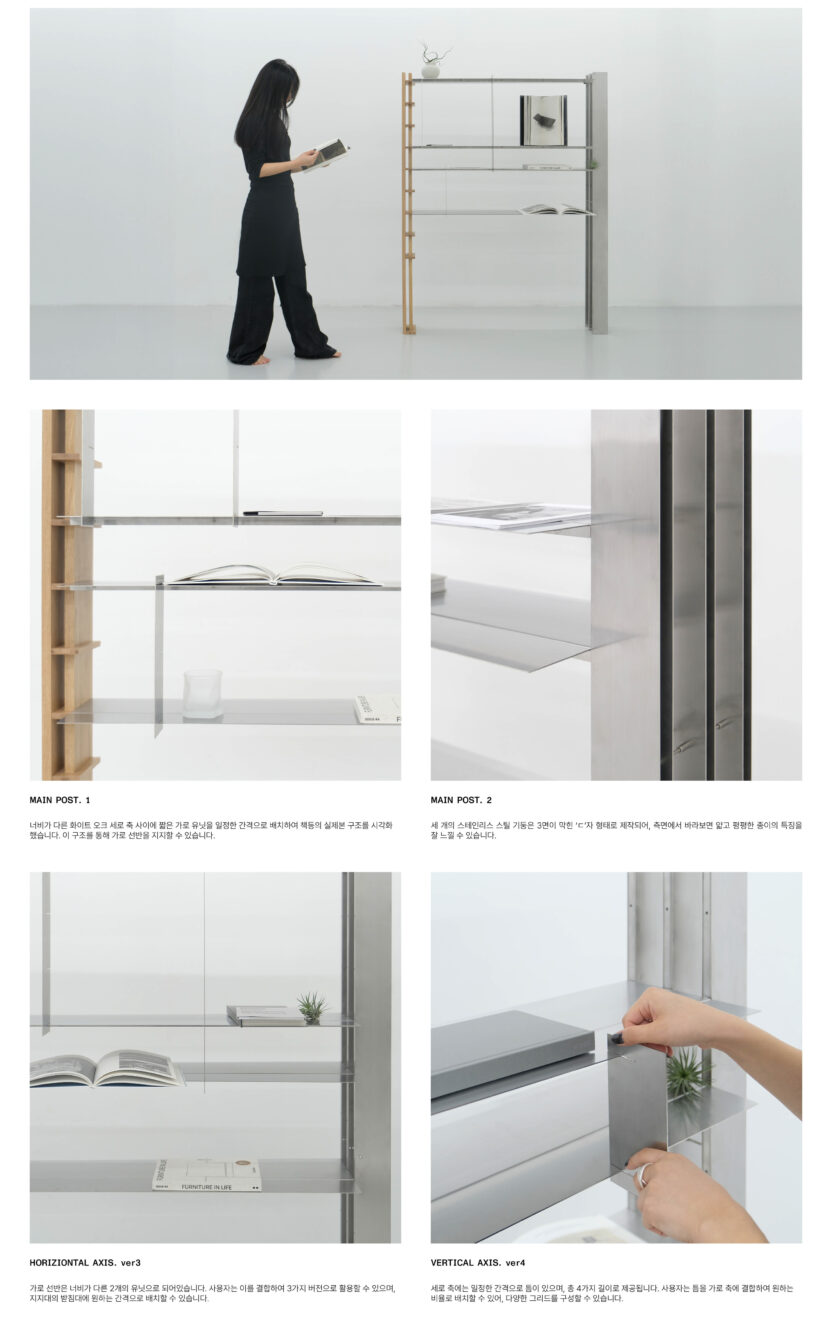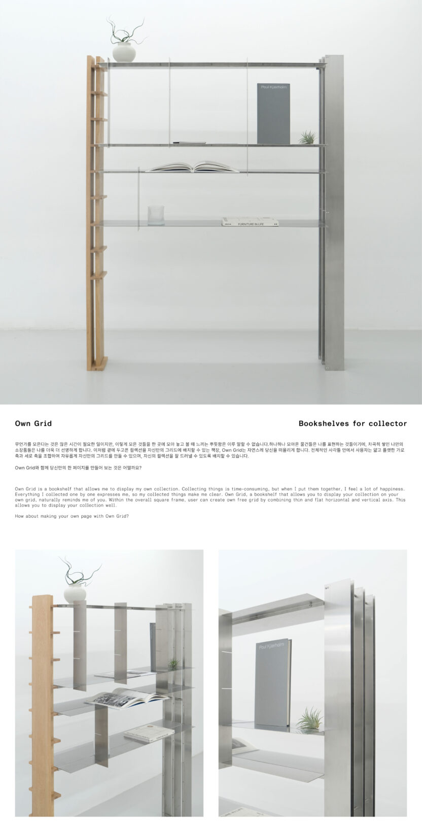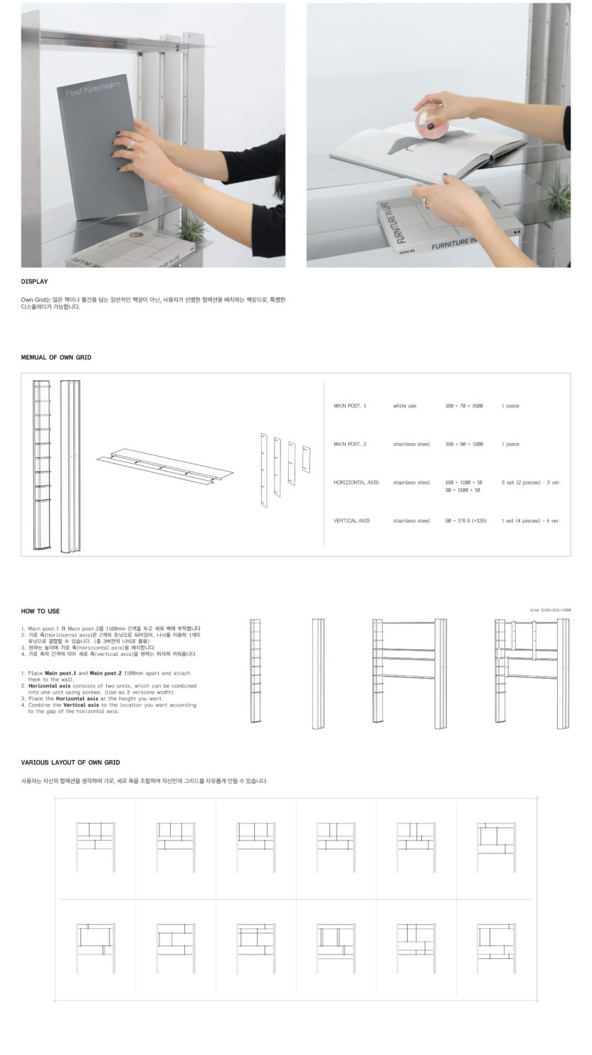 이처럼 곁에 두고 싶은 컬렉션을 자신만의 그리드에 배치할 수 있는 책장 'Own Grid'는 자연스럽게 당신을 떠올리게 한다. 전체적인 사각 틀 안에서 사용자는 얇고, 플랫한 가로 축과 세로 축을 조합하여 자유로운 자신만의 그리드를 만들 수 있고, 이를 통해 자신의 컬렉션이 잘 드러나게 배치할 수 있다.