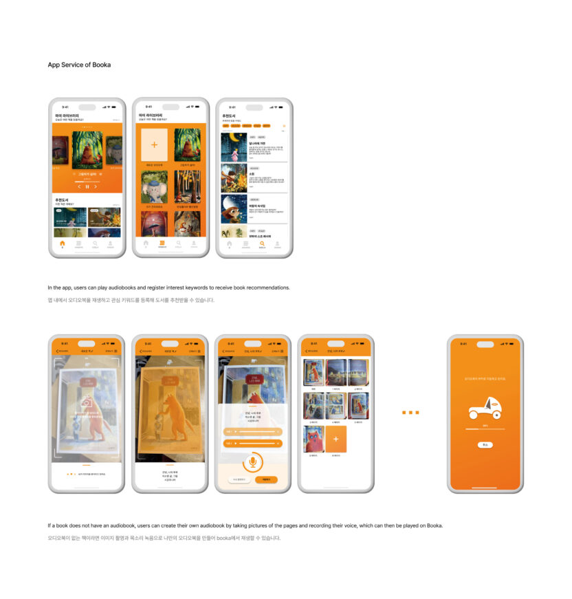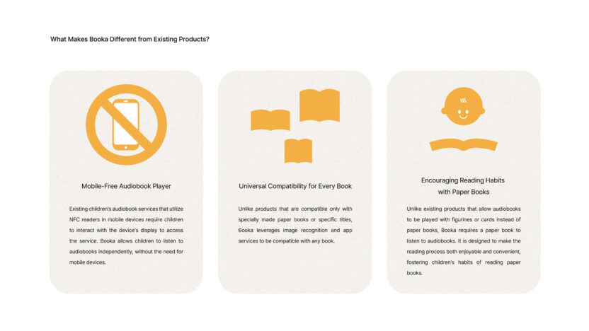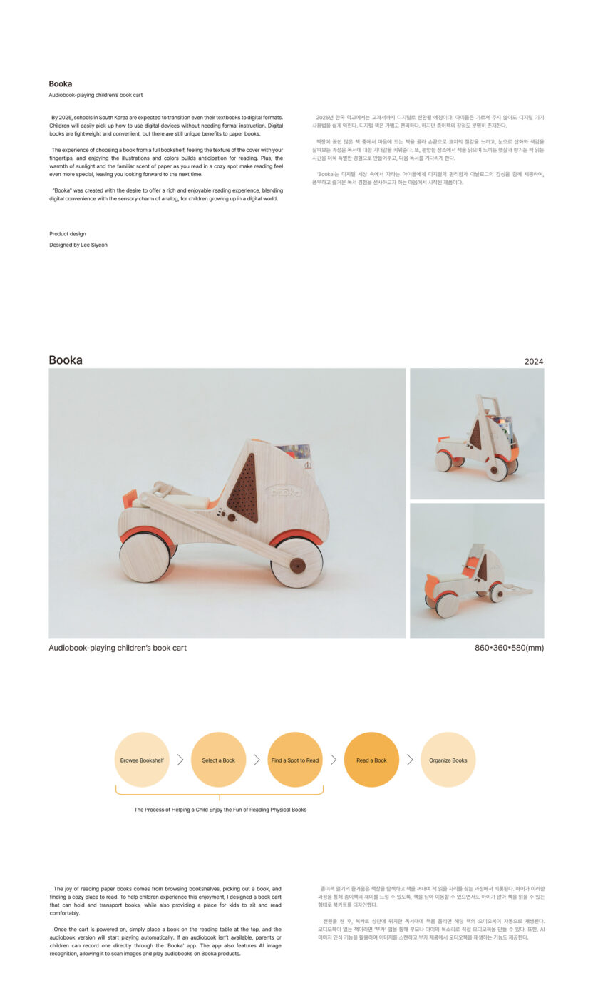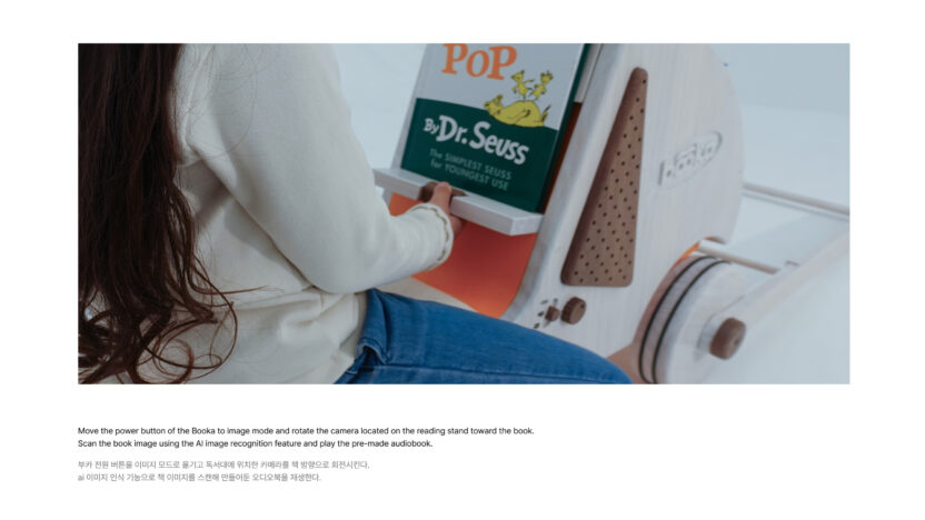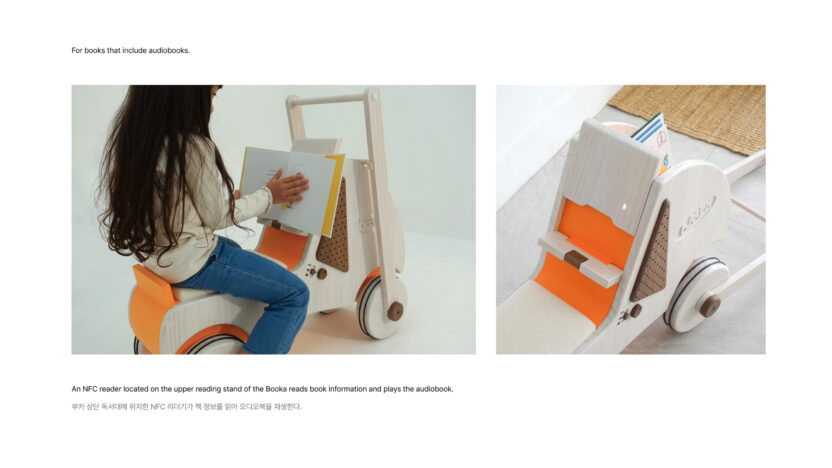 2025년 한국 학교에서는 교과서까지 디지털로 전환될 예정이다. 디지털 책은 가볍고 편리하지만, 종이책만의 장점도 여전히 존재한다. 책장을 탐색하고, 손끝으로 표지의 질감을 느끼며, 편안한 장소에서 햇살과 책의 향기를 느끼는 과정은 종이책만의 특별한 경험이다. ‘부카’는 디지털 기기와 아날로그 감성을 조화하여, 아이들에게 독서의 즐거움을 제공하기 위해 탄생했다. 책을 북카트에 올리면 오디오북이 자동으로 재생되며, 오디오북이 없는 경우 ‘부카’ 앱으로 부모나 아이의 목소리로 직접 녹음할 수도 있다. AI 이미지 인식 기능으로 책 이미지를 스캔해 오디오북을 재생하는 기능도 포함되어 있다.