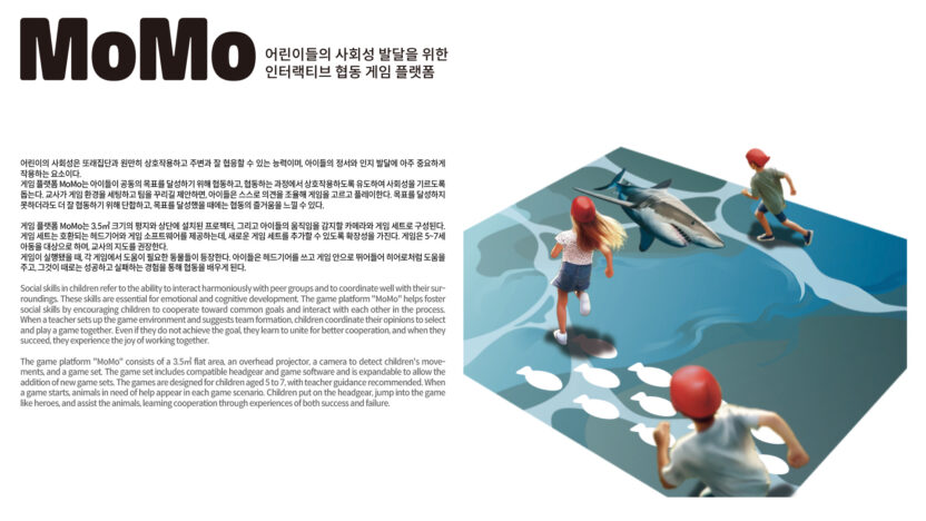게임 플랫폼 MoMo는 아이들이 공동의 목표를 달성하기 위해 협동하고, 협동하는 과정에서 상호작용하도록 유도하여 사회성을 기르도록 돕는다. MoMo는 3.5㎡ 크기의 평지와 상단에 설치된 프로젝터, 그리고 아이들의 움직임을 감지할 카메라와 게임 세트로 구성된다. 게임 세트는 호환되는 헤드기어와 게임 소프트웨어를 제공하는데, 새로운 게임 세트를 추가할 수 있도록 확장성을 가진다. 아이들은 스스로 의견을 조율해 게임을 고르고 플레이할 수 있다. 게임이 실행됐을 때, 각 게임에서 도움이 필요한 동물들이 등장한다. 아이들은 헤드기어를 쓰고 게임 안으로 뛰어들어 히어로처럼 도움을 주고, 그것이 때로는 성공하고 실패하는 경험을 통해 협동을 배우게 된다.