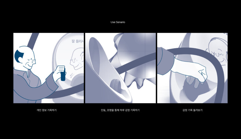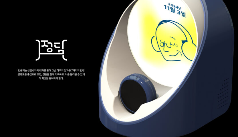 이야기를 담는 우물이라는 뜻을 가진 '정담'은 경도인지장애 노인의 기억력 보존과 함께 다른 신체적, 정신적 부분을 케어해주는 인공지능 상담사입니다. 사용자가 하루를 보낸 뒤, 인공지능 상담사와 대화하며 사용하는 단어 등의 언어적 요소와, 말할 때의 떨림, 목소리의 높낮이 등 다양한 반언어적 요소를 통해 사용자의 그날 감정을 분석합니다. 그리고 그 감정을 조명과 진동으로 표현해 보여주고, 미래에 다시 기록을 돌려볼 수 있게 하여 해당 날짜의 일을 회상하기 용이한 환경을 만들어줍니다.