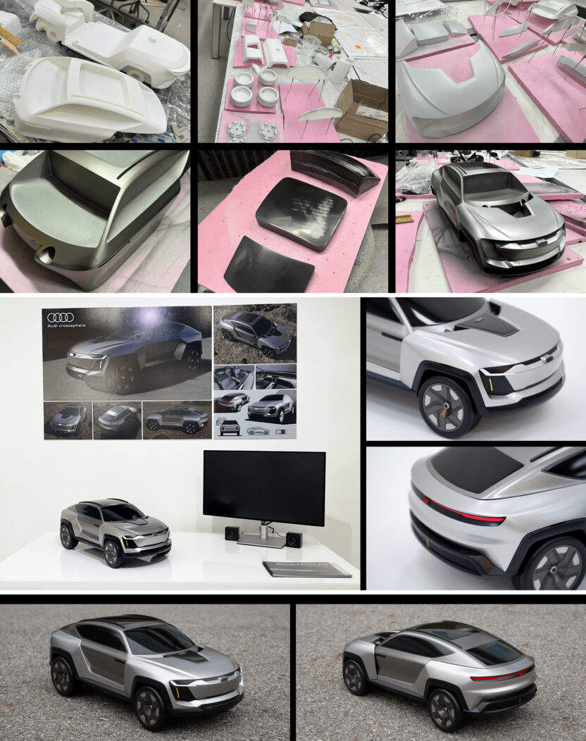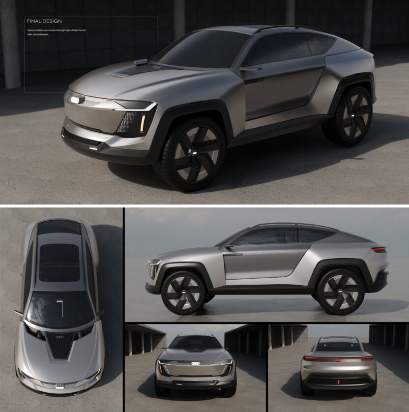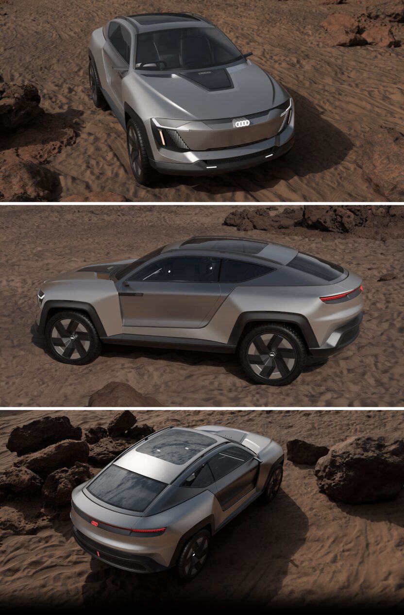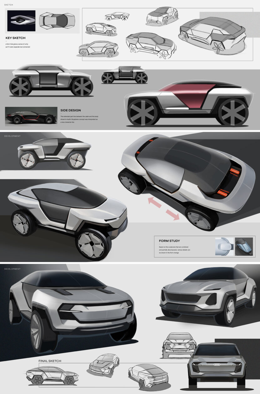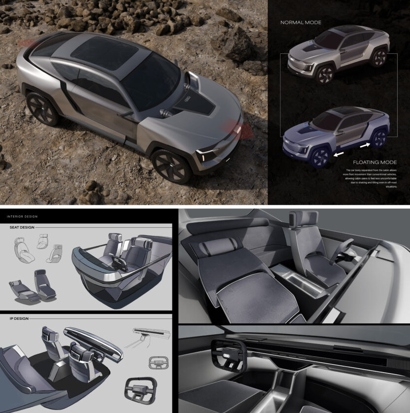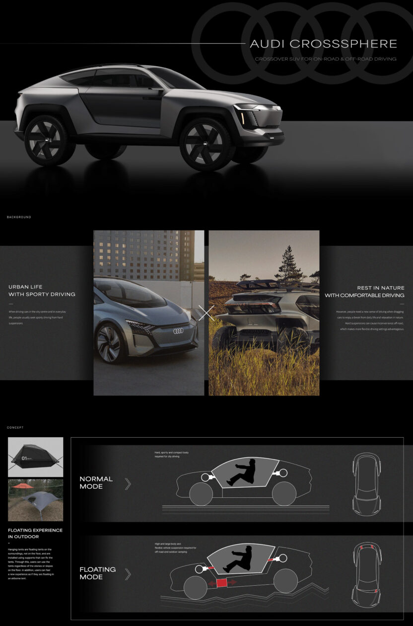 아웃도어 캠핑을 위한 용품인 행잉텐트는 외부 지지구조를 통해 바닥 환경에 구애받지 않고 공중에서 수평 상태를 유지할 수 있는 텐트이다. 아우디 크로스스피어는 이러한 행잉텐트의 구조를 이용하여 사용자가 도심과 험지의 주행을 모두 편안하게 즐길 수 있도록 고안된 모빌리티이다. 일상적인 상황에서 캐빈을 바디에 고정하여 사용자가 스포티한 드라이빙을 즐길 수 있는 노말폼과 캐빈을 바디에서 분리하여 외부 지지 구조를 통해 캐빈을 공중에 띄워 사용자가 편안한 드라이빙을 느낄 수 있는 플로팅폼, 이 두가지 모드를 통해 상반된 주행경험을 선사한다.