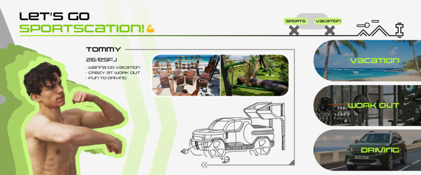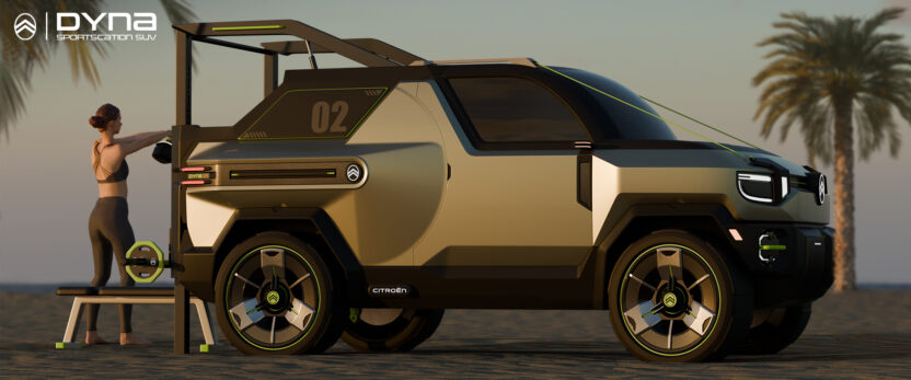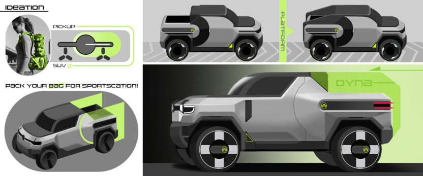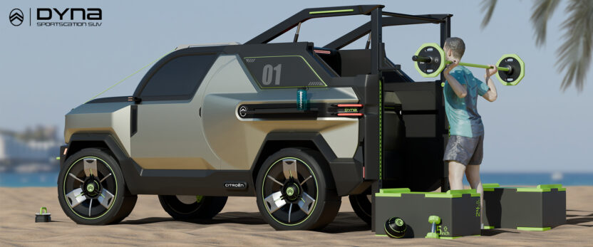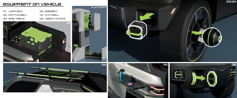 운동과 건강관리가 큰 인기인 요즘, 휴가를 가서 스포츠를 즐기고 스포츠를 즐기기 위해 휴가를 가는 스포츠케이션이 새로운 여행 트렌드로 떠오르고 있다. DYNA는 크로스핏, 웨이트 트레이닝 등을 즐기는 피트니스 마니아층을 타겟으로 하여 이들이 전문 시설에서만이 아닌 원하는 휴양지에서도 운동을 즐길 수 있게 하는 2인승 스포츠케이션 SUV이다. 원하는 장소에서 랙을 전개하여 나만의 워크아웃 스팟을 형성하고 차량의 파츠들을 탈착하여 운동장비로 사용하면서 모빌리티와 함께 스포츠케이션을 즐기는 새로운 여행 스타일을 제안한다.
