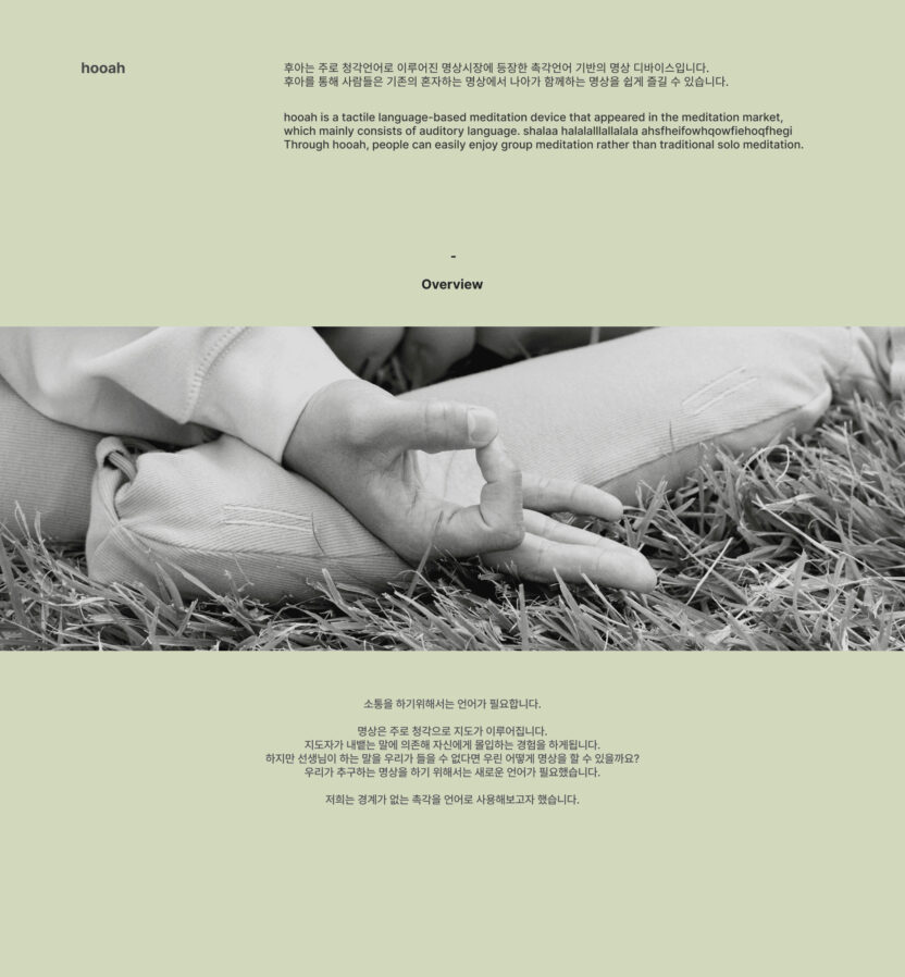 후아는 주로 청각언어로 이루어진 명상시장에 등장한 촉각 언어 기반의 명상 디바이스입니다. 이 프로젝트는 들을 수 없다면, 어떻게 명상을 할 수 있을까? 라는 물음에서 출발했습니다. 청인 명상 지도자가 촉각을 통해 농인 초심자에게 소리 없이 명상을 지도할 수 있는 방법을 고민하여, 최종적으로 촉각을 활용한 제품 숨과 이음이 탄생하게 되었습니다. 후아는 기존에 명상 세션에 참여하기 어려웠던 농인들도 명상에 참여할 수 있도록 돕고, 나아가 청인과 농인이 함께 명상할 수 있는 환경을 제공하고 있습니다. 후아를 통해 우리는 기존의 혼자하는 명상에서 나아가 함께하는 명상을 경험하고 우리는 이를 통해, 새로운 소통의 기회를 얻게 됩니다.